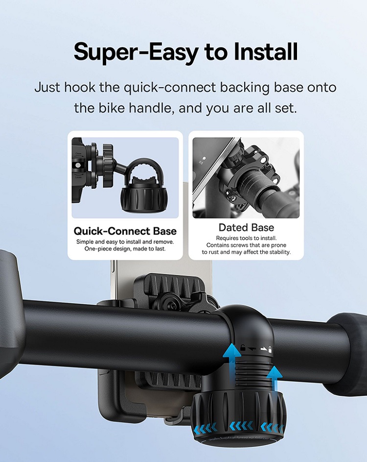 Suportul Baseus pentru bicicleta imbina stabilitatea cu functionalitatea, asigurand ca smartphone-ul tau ramane fix si protejat chiar si pe drumuri denivelate sau la franari bruste. Designul sau cu tehnologie anti-vibratii si clema semi-inchisa permite atasarea telefonului cu o singura mana, oferind confort maxim si acces rapid la dispozitiv.