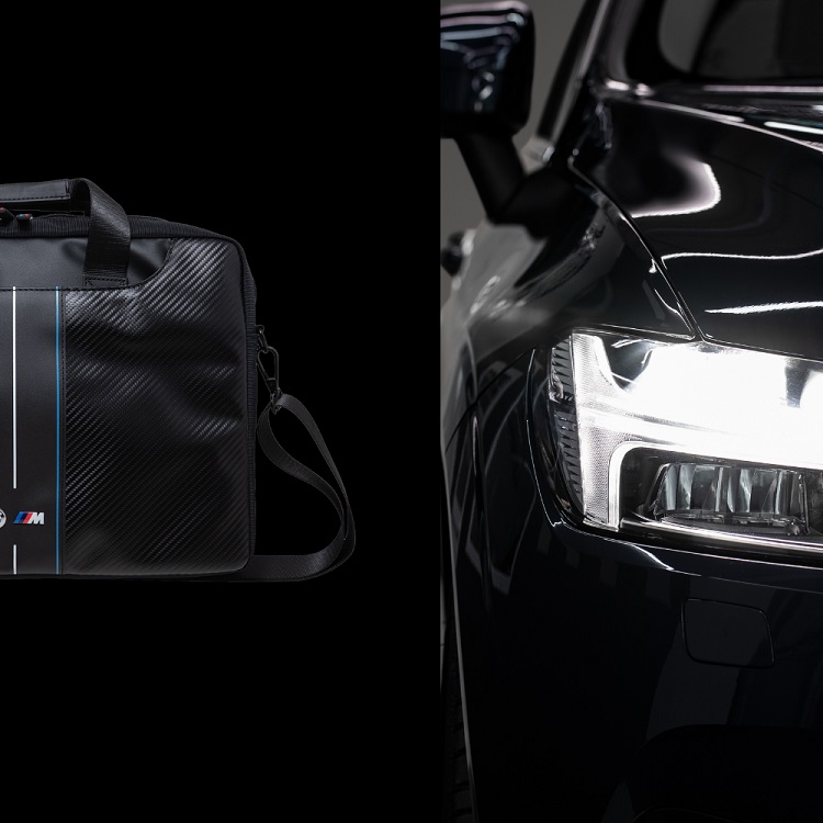 Partea din fata a gentii a fost facuta mai atractiva datorita utilizarii unui motiv unic de carbon aplicat pe pielea ecologica delicata la atingere. Motivul din fibra de carbon asigura caracterul exclusivist al colectiei si atrage atentia. Colectia impresioneaza prin dungi inguste in culorile pachetului M Performance situat central in mijlocul gentii, precum si siglele marca BMW si M Performance, care confirma si autenticitatea produsului.