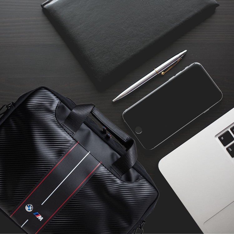 Partea din fata a gentii a fost facuta mai atractiva datorita utilizarii unui motiv unic de carbon aplicat pe pielea ecologica delicata la atingere. Motivul din fibra de carbon asigura caracterul exclusivist al colectiei si atrage atentia. Colectia impresioneaza prin dungi inguste in culorile pachetului M Performance situat central in mijlocul gentii, precum si siglele marca BMW si M Performance, care confirma si autenticitatea produsului.