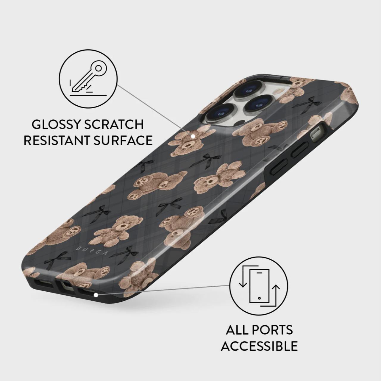 Are un design care imbina inocenta si rafinamentul cu ursuleti de plus si un fundal gri sic, husa este o intoarcere la nostalgia reconfortanta si actualizata cu o nota de glam modern.