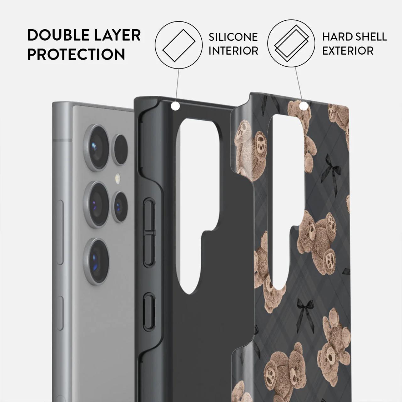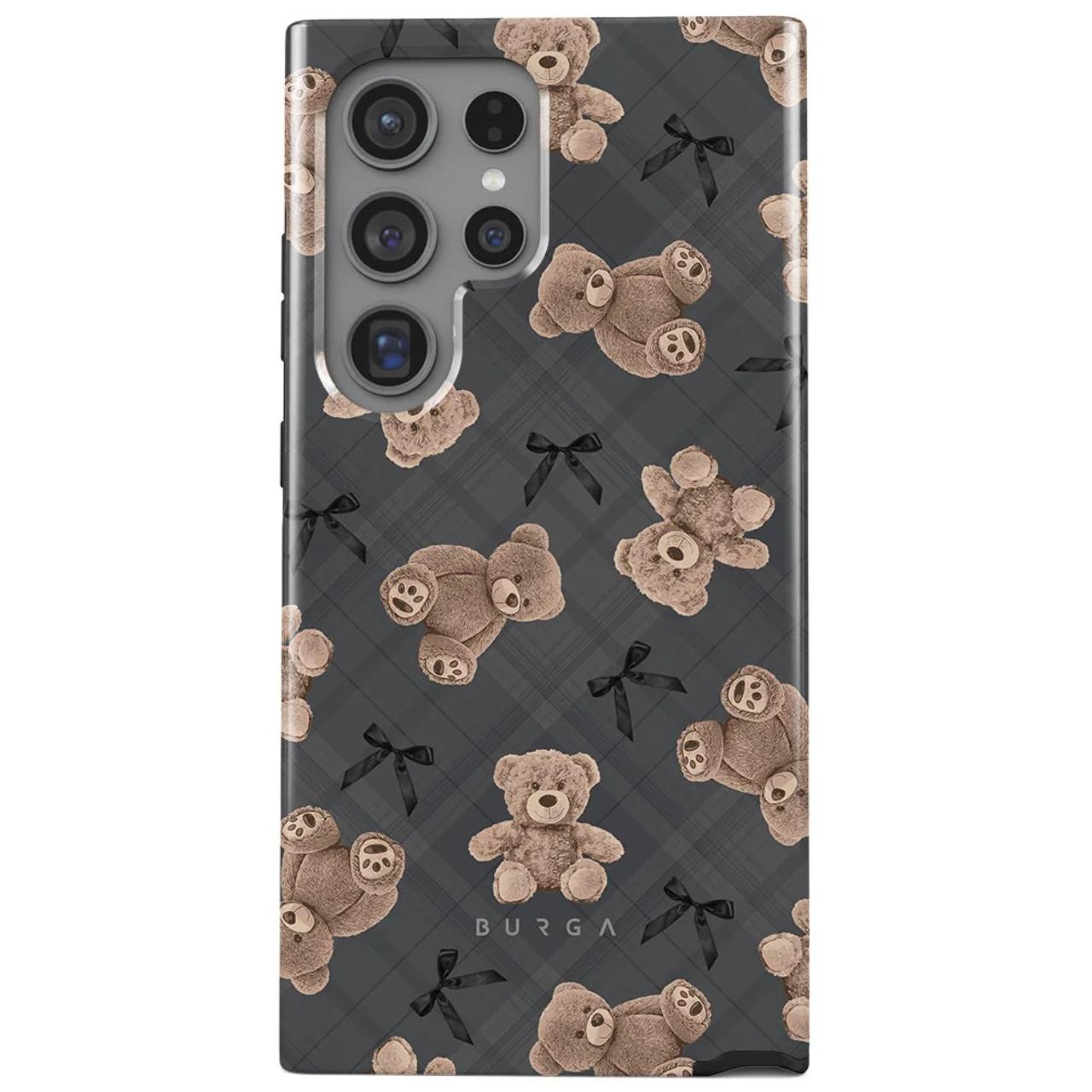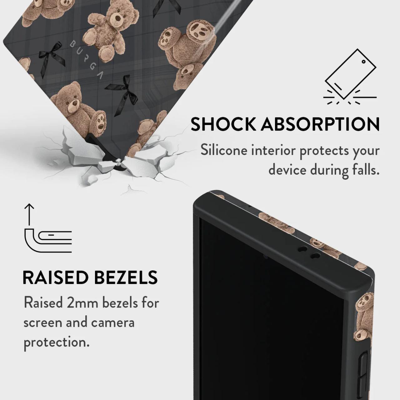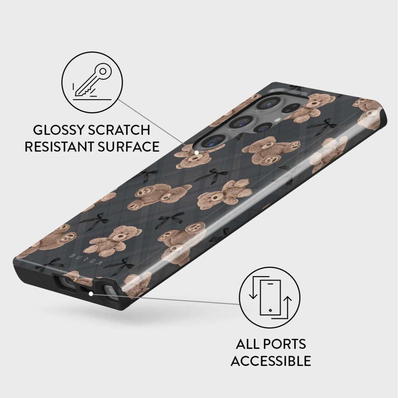 Are un design care imbina inocenta si rafinamentul cu ursuleti de plus si un fundal gri sic, husa este o intoarcere la nostalgia reconfortanta si actualizata cu o nota de glam modern.