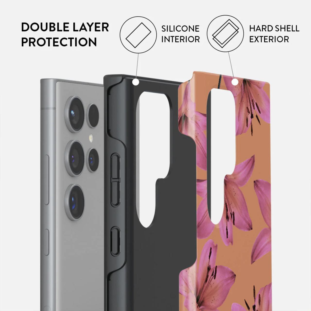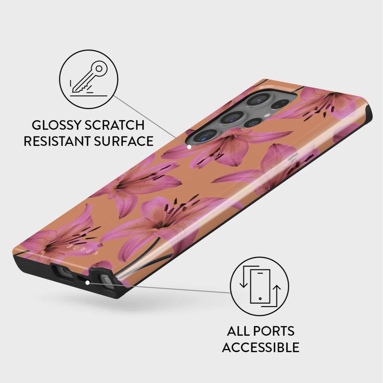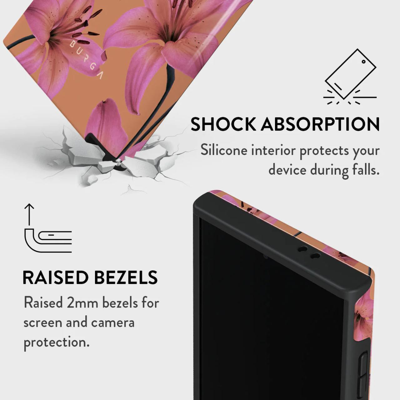 Husa Burga are un design inspirat de inflorirea fara efort a crinilor, reflectand frumusetea imbratisarii momentelor spontane ale vietii.