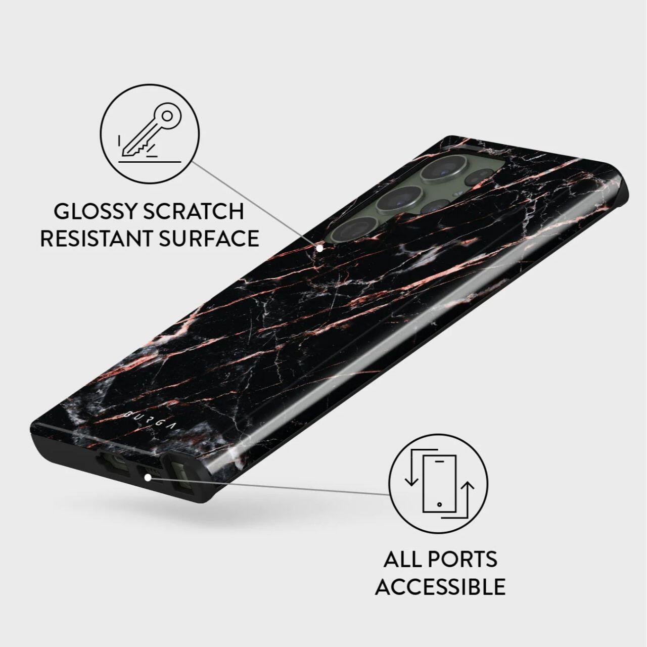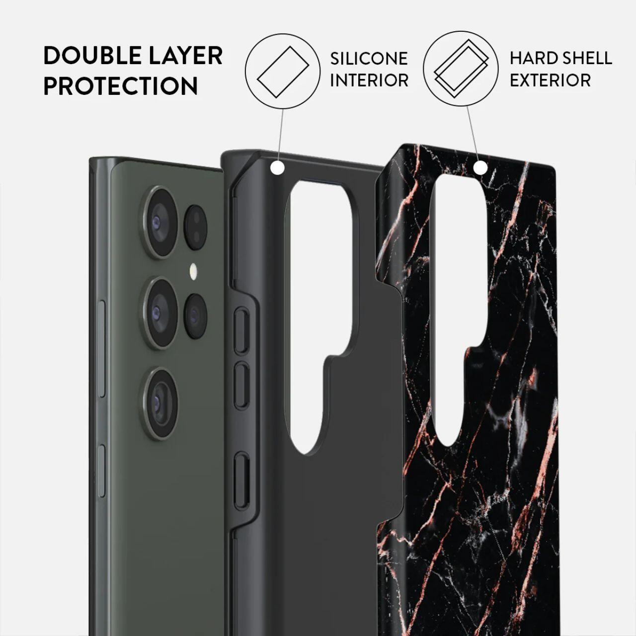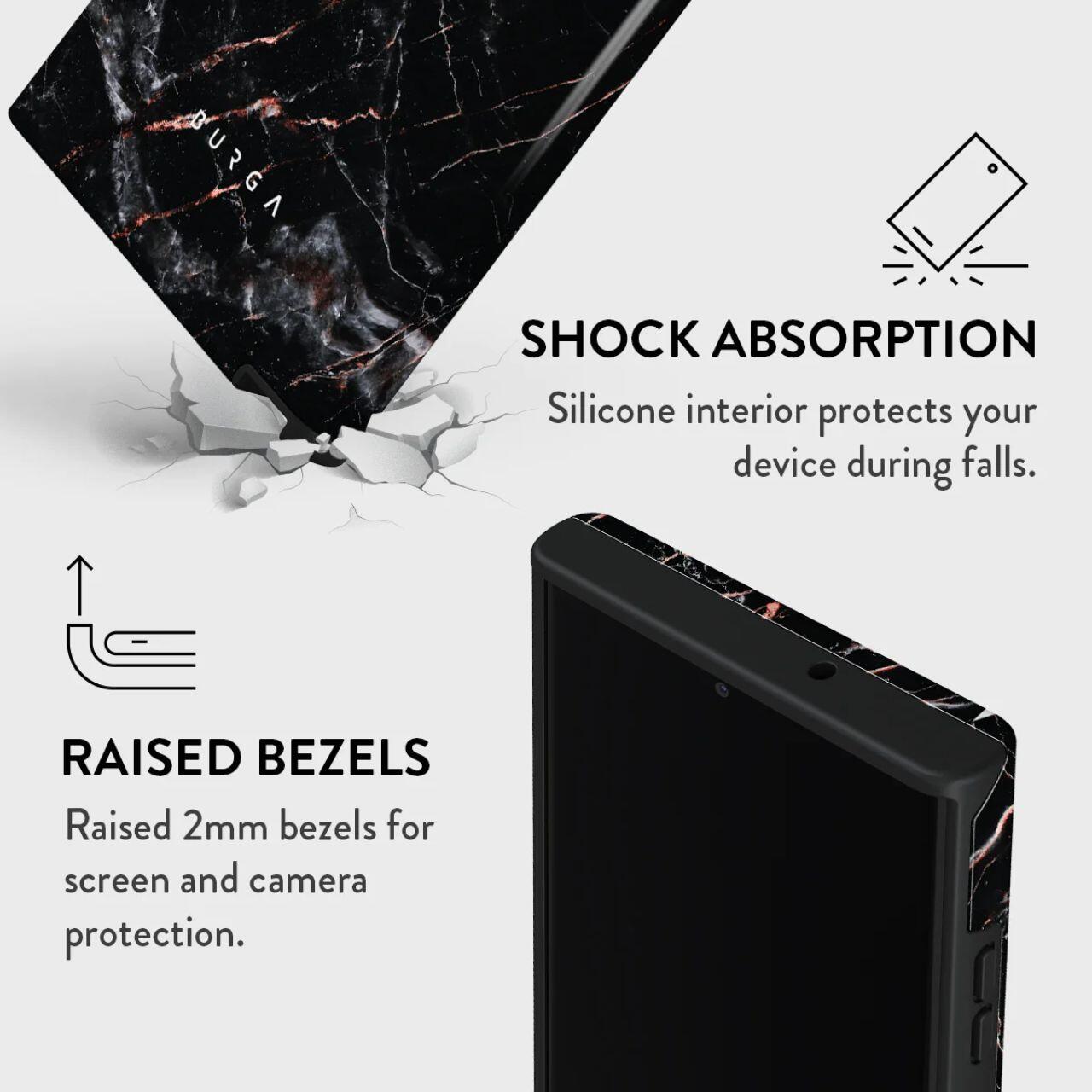 Husa Dual Layer Rose Gold Marble de la Burga este proiectata in mod unic cu o structura hibrid dual-strat. Stratul interior de TPU silicon si o carcasa exterioara de PC rezistenta, de calitate militara, ofera absorbtie la soc, durabilitate si aparare robuza impotriva zgarieturilor in timp ce ramele inaltate de 2 mm ofera protectie a ecranului si a camerei.