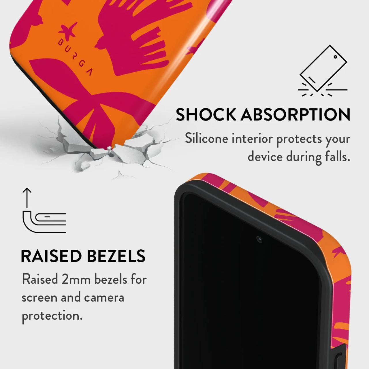 Husa Dual Layer Siesta pentru iPhone 14 Pro de la Burga are un model unic si colorat, iar interiorul din silicon va protejeaza dispozitivul in timpul caderilor in timp ce ramele inaltate de 2 mm ofera protectie a ecranului si a camerei.