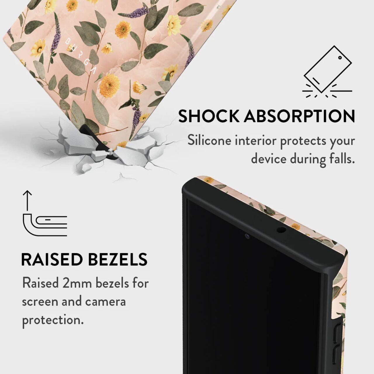 Prezinta un model de flori atemporal, cu nuante moi, cu un strop de lavanda si culori galbene, va adauga un strop de energie stilului tau, protejand in acelasi timp telefonul de caderi periculoase.
