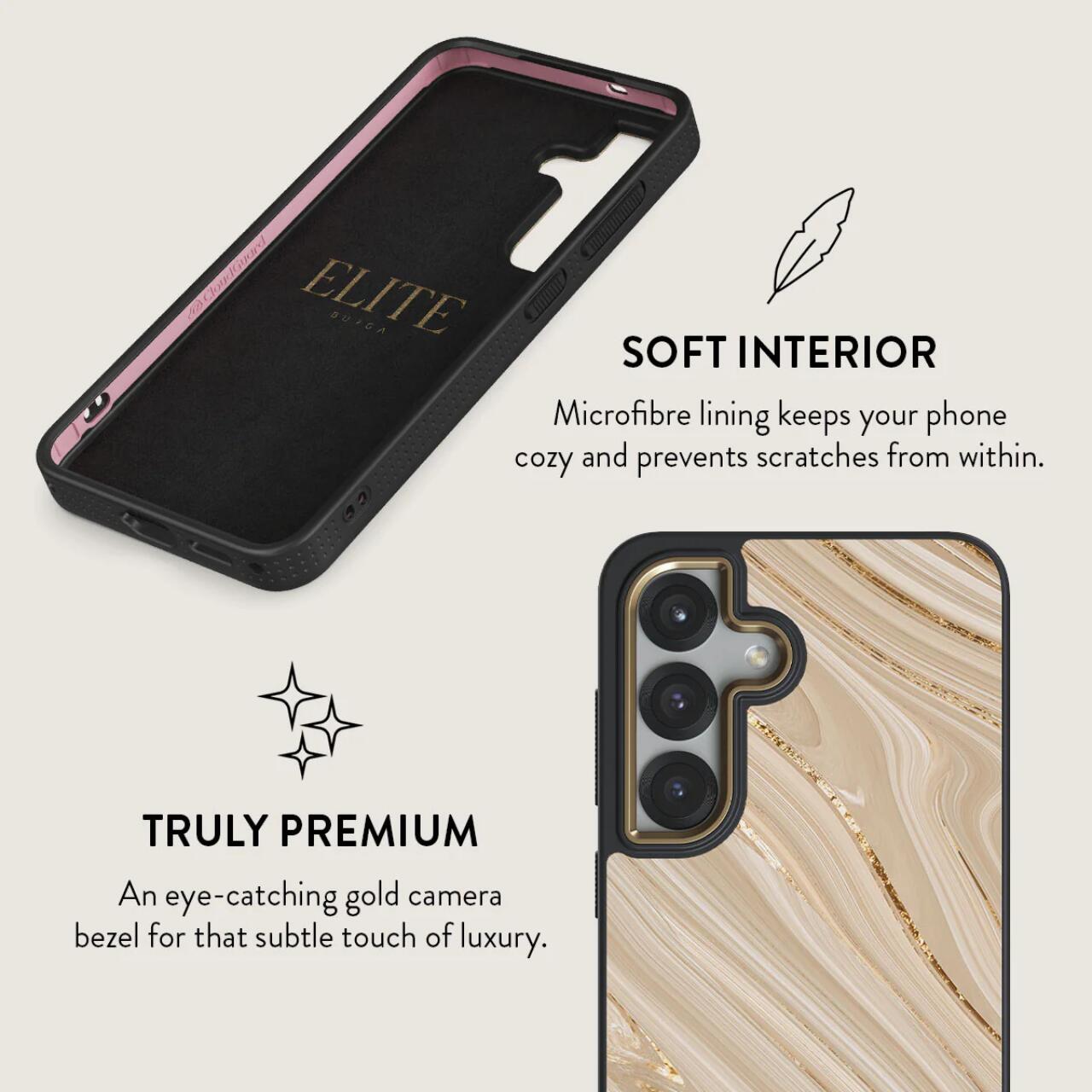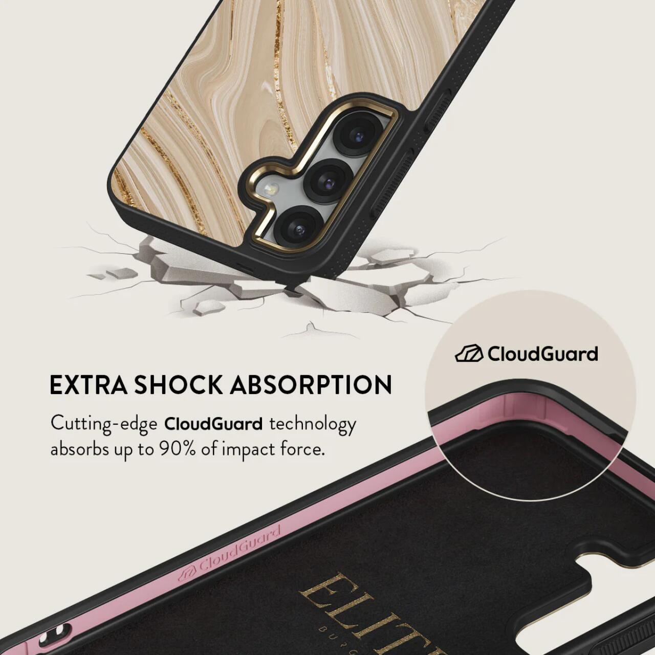 Husa Elite Gold Full Glam pentru Samsung Galaxy S25 Plus de la Burga, dispune de tehnologia CloudGuard ce ofera protectie impotriva deteriorarii, fiind construita pentru absorbtia socurilor si aparare. In timp ce exteriorul sau dur protejeaza impotriva zgarieturilor si caderilor, stratul sau interior de silicon TPU amortizeaza usor telefonul absorbind pana la 90% din impact.