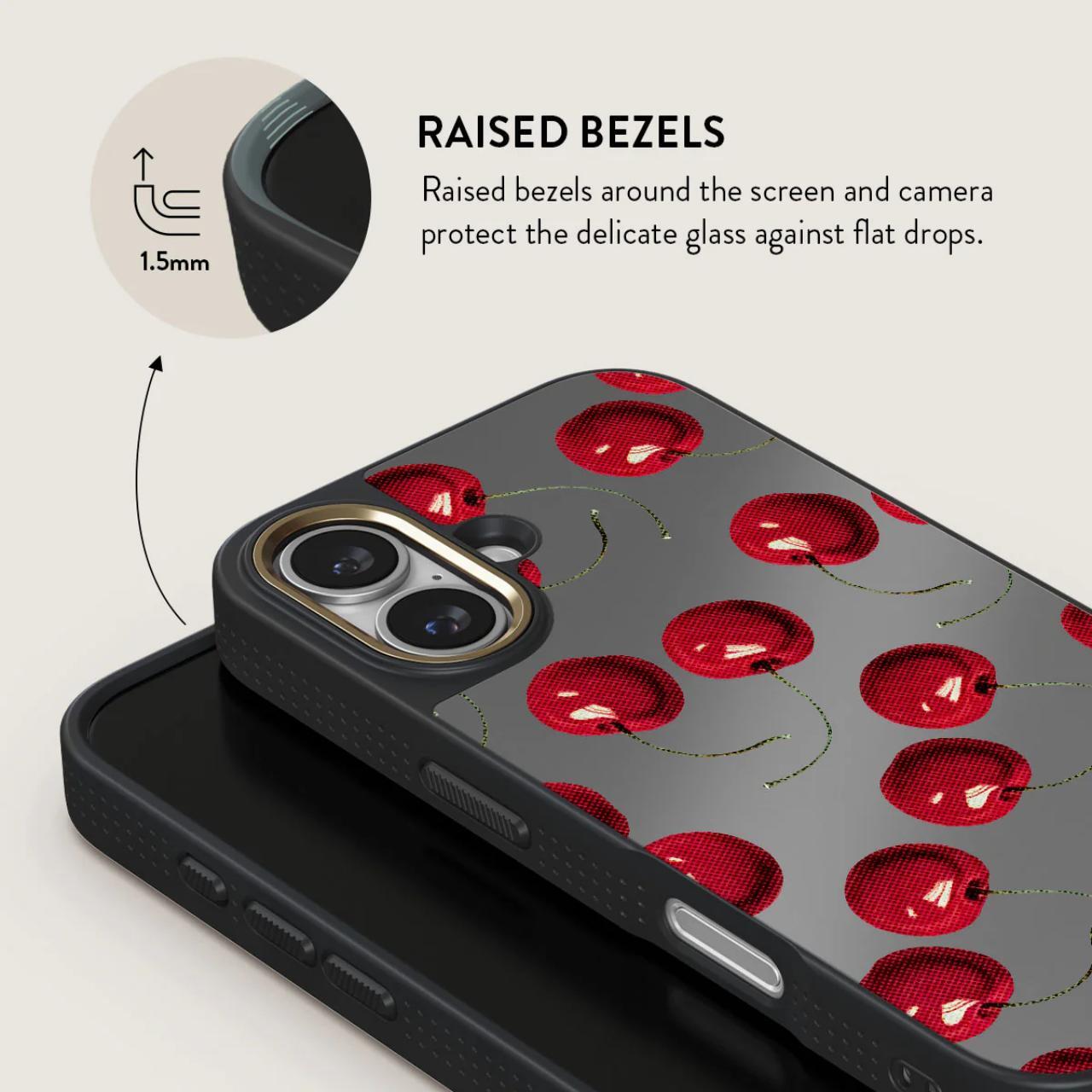 Cherrybomb - pe un fundal negru profund, ies in evidenta ciresele rosii bogate. Tentant si indraznet, designul nostru de husa pentru iPhone 16 este perfect pentru oricine ii place sa pastreze lucrurile simple, dar izbitoare.