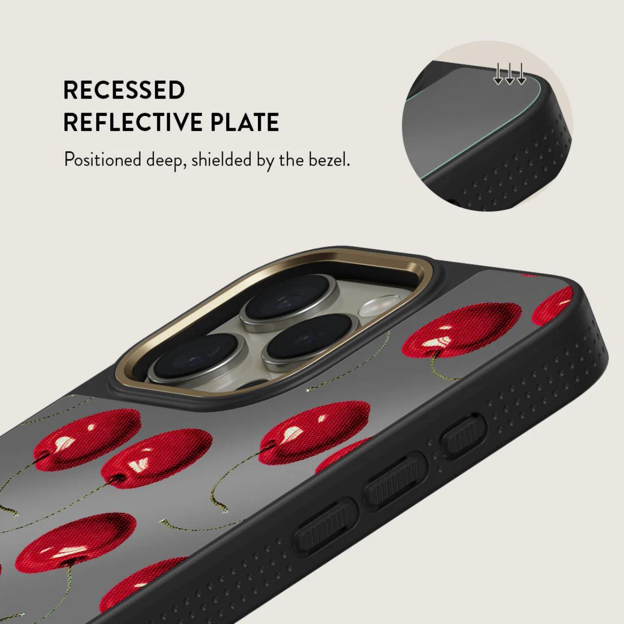 Cherrybomb - pe un fundal negru profund, ies in evidenta ciresele rosii bogate. Tentant si indraznet, designul nostru de husa pentru iPhone 16 Pro este perfect pentru oricine ii place sa pastreze lucrurile simple, dar izbitoare.