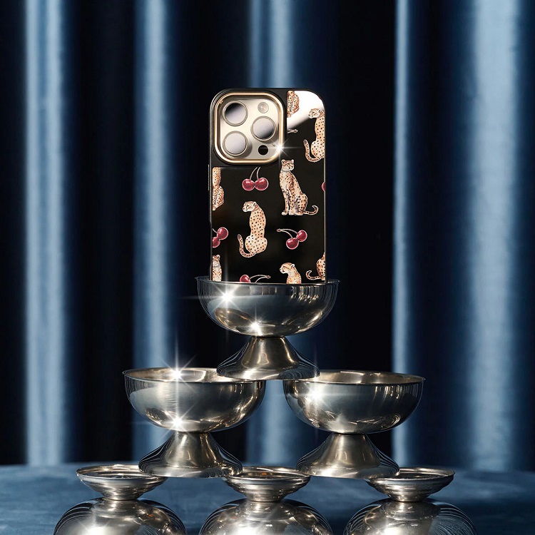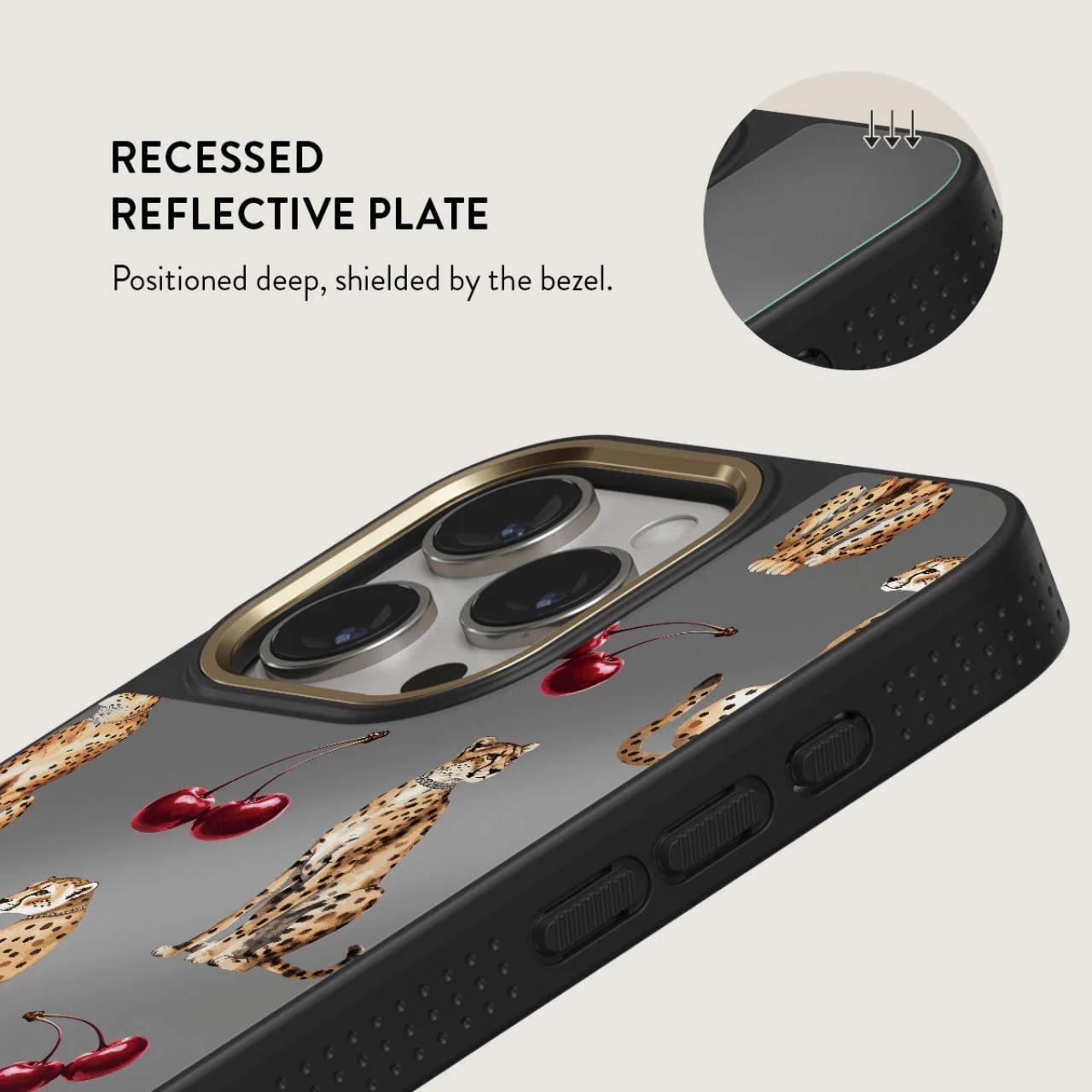 Cougar - acest design uimitor indraznet si stralucitor al husei de telefon iPhone 15 Pro prezinta: modele de ghepard, gheparzi, cirese si ofera energie indrazneata.