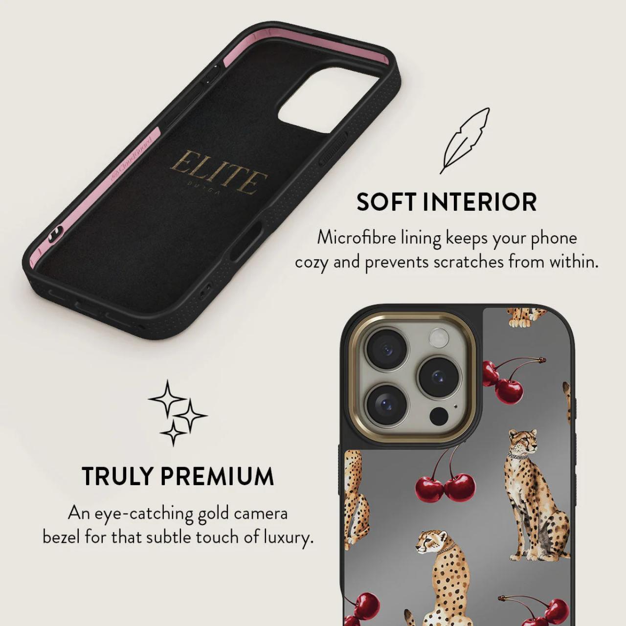 Cougar - acest design uimitor indraznet si stralucitor al husei de telefon iPhone 16 Pro Max prezinta: modele de ghepard, gheparzi, cirese si ofera energie indrazneata.