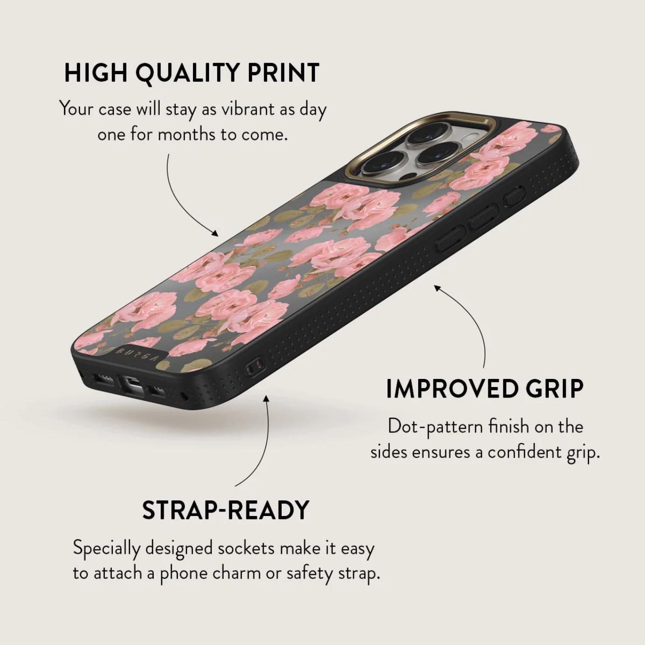 Desert Rose - acest design uimitor al husei de telefon iPhone 15 Pro Max prezinta trandafiri roz indrazneti pe un fundal bogat, pamantesc, creand un contrast captivant. Creat pentru cei care prospera in extraordinar si gasesc frumusetea in accidentat.