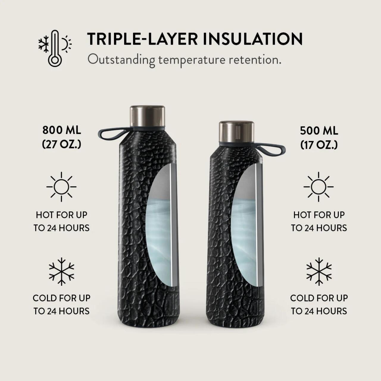 Cu un finisaj rezistent la zgarieturi, anti-rugina si un exterior dur, acesta sticla reutilizabila de lunga durata cu dimensiunea perfecta, subtire, are o capacitate de 17 oz, 10 inci inaltime si 2,8 inci latime. Indiferent daca calatoresti prin lume sau in cursa zilnica, se potriveste cu usurinta in suportul pentru pahare din masina, in buzunarul pentru sticle in rucsac sau in geanta preferata, astfel incat sa poti ramane mereu hidratat cu stil!