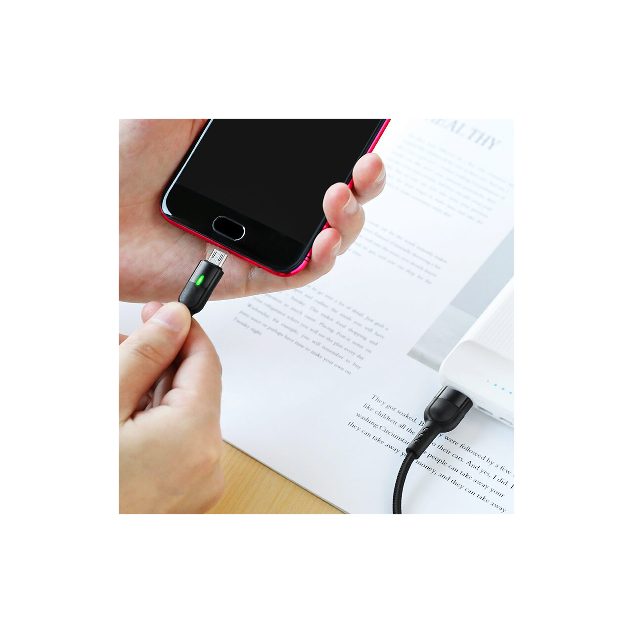 Cablul este plasat intr-o impletitura puternica din nailon dopuri din aluminiu rezistente la abraziune si oxidare, iar lumina LED faciliteaza gasirea dispozitivului in intuneric.