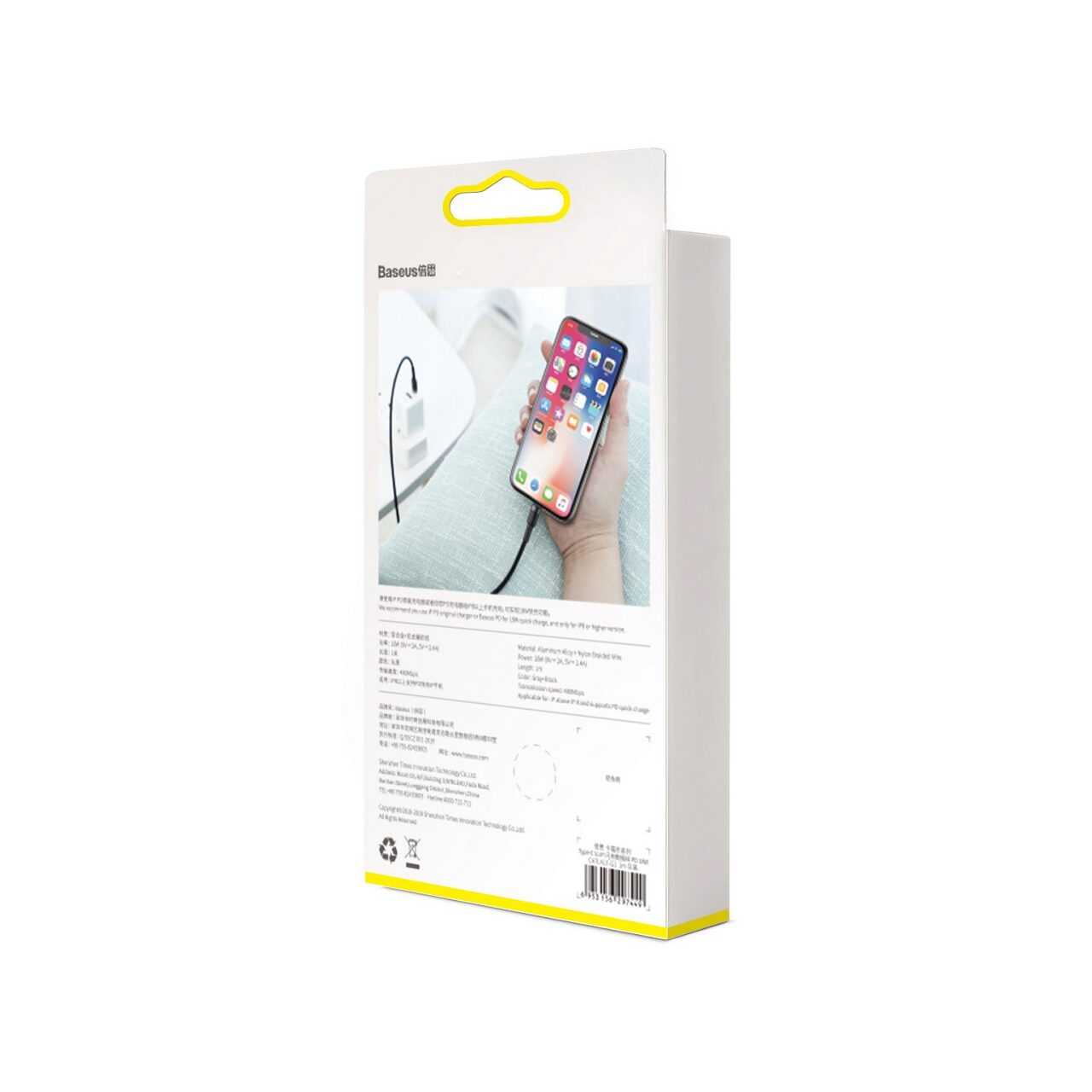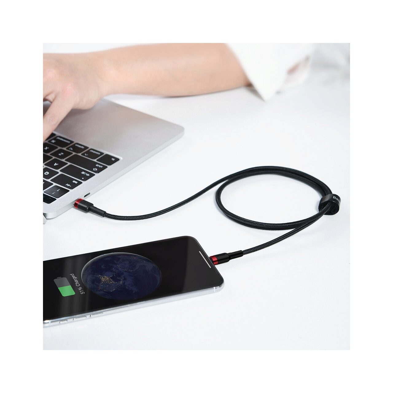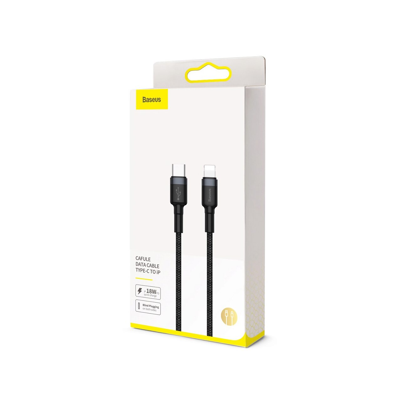 Cablul Cafule Series Type-C la Lightning de la Baseus se poate utiliza atat pentru incarcare cat si pentru sincronizarea rapida a datelor impreuna cu dispozitivele cu conector Type-C si Lighting cu putere de maxim 18W.