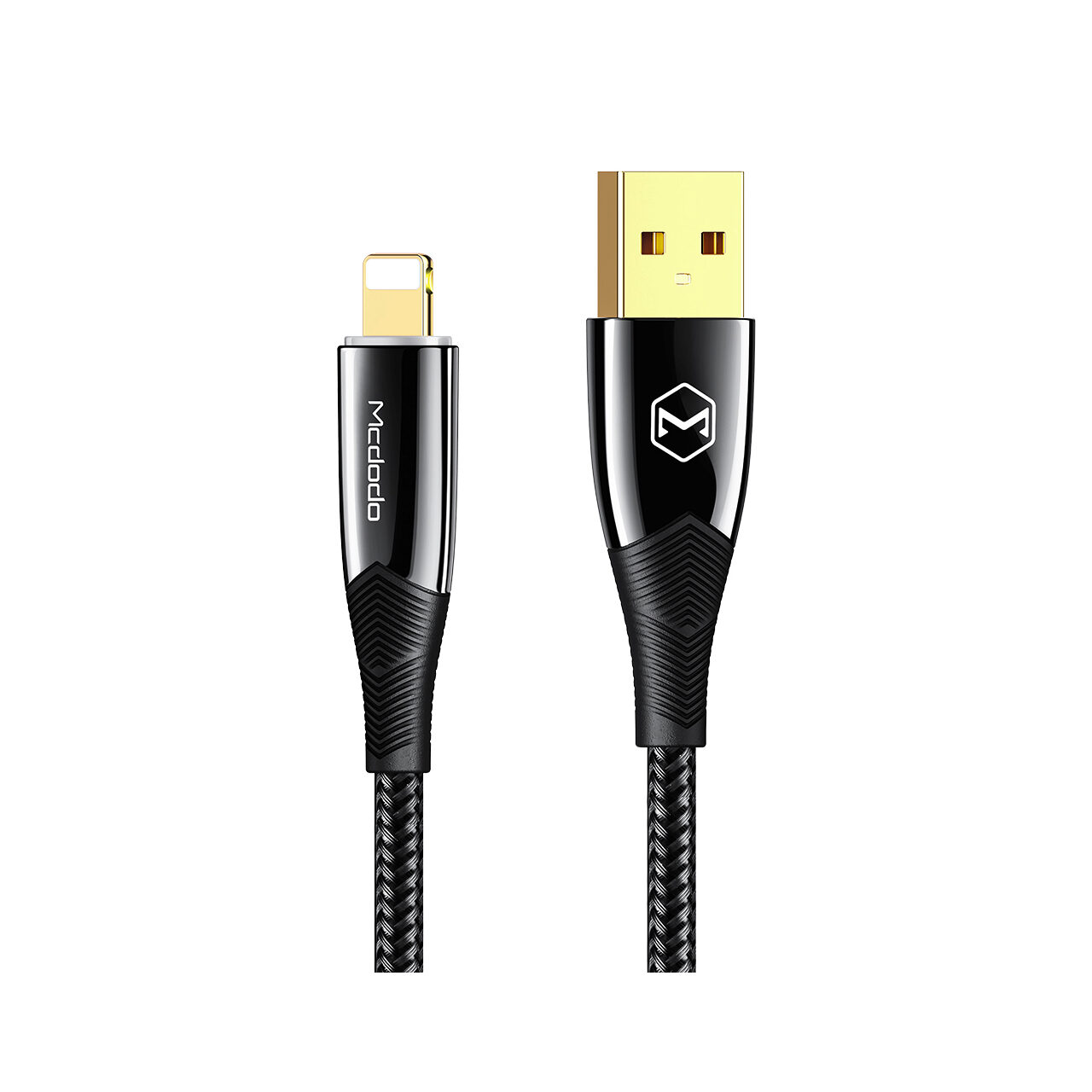 Cablu de incarcare de la Mcdodo Shark Series Lightning cu impletitura nylon pentru telefoane si tablete, cu lungimea de 1,2 metri, invelis textil (anti-incalcire) pe toata lungimea si protectii pentru mufe din aliaj de zinc Gold anticoroziv, cu extensii de legatura din silicon pentru o durabilitate mai buna.