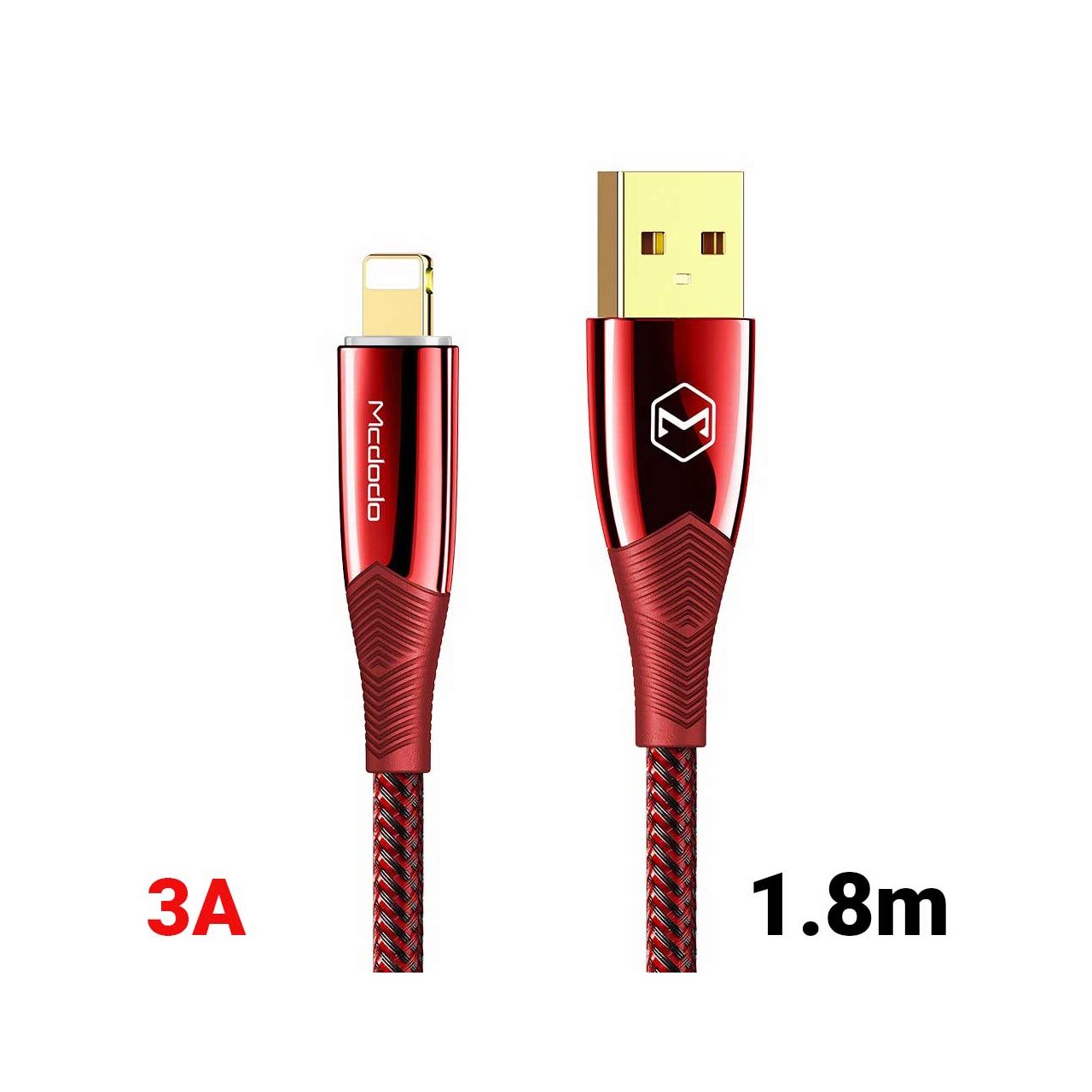 Cablu de incarcare de la Mcdodo Shark Series Lightning cu impletitura nylon pentru telefoane si tablete, cu lungimea de 1,8 metri, invelis textil (anti-incalcire) pe toata lungimea si protectii pentru mufe din aliaj de zinc Gold anticoroziv, cu extensii de legatura din silicon pentru o durabilitate mai buna.