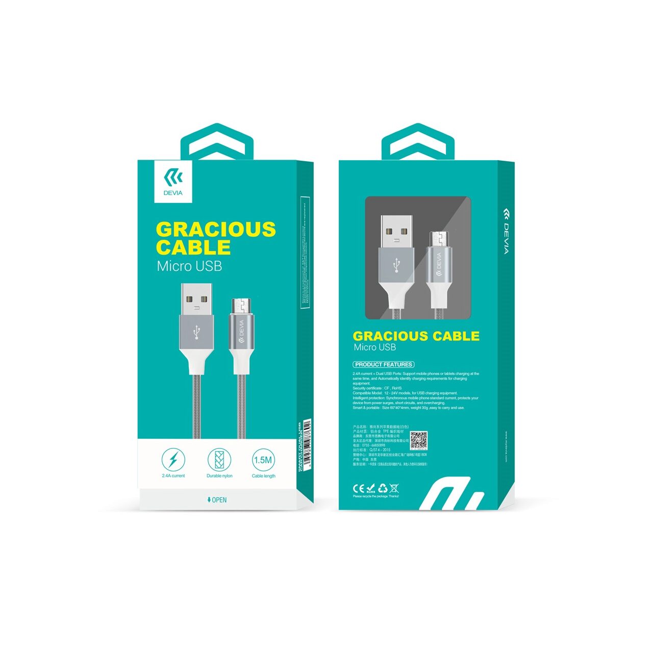 Cablul Gracious produs de Devia are lungimea de 1.5 m si este imbracat in plastic cauciucat, iar in interior firul este protejat de o impletitura textila. Design-ul nu ii permite sa se incurce, iar aliajul de aluminiu din care sunt confectionate imbinarile confera o rezistenta crescuta.