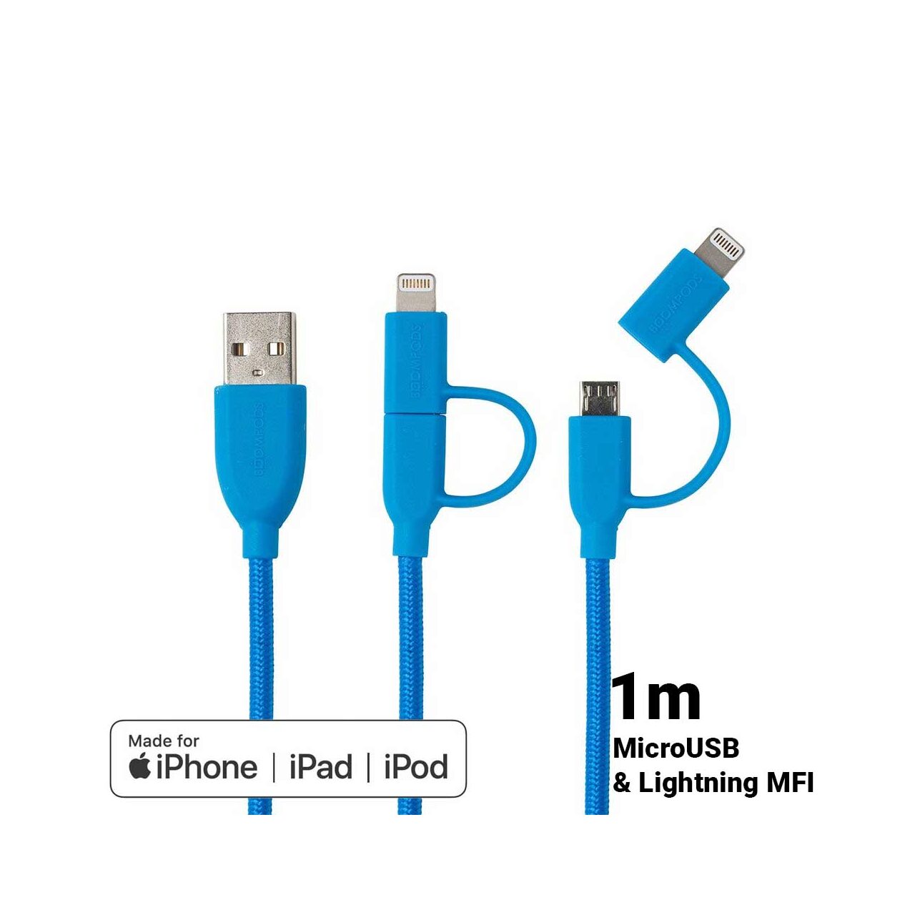 Boompods Cablu Duo MicroUSB & Lightning MFI Blue (1m, impletitura textila)