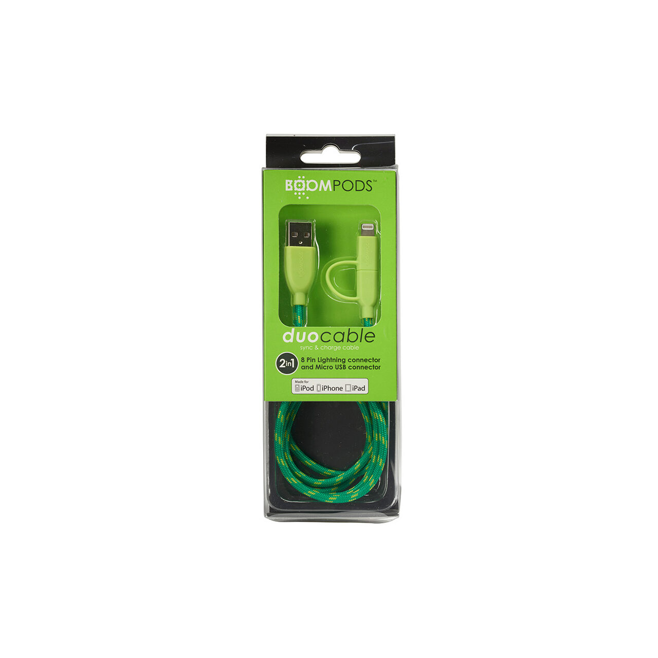 Boompods Cablu Duo MicroUSB & Lightning MFI Green (1m, impletitura textila)