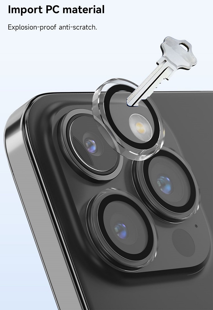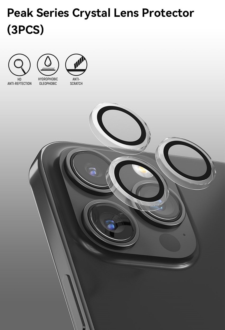 Folie Sticla Camera Peak Series Crystal pentru iPhone 15 Pro / 15 Pro Max de la Devia este fabricata din sticla premium cu marginile realizate din policarbonat (transparent) si ofera o protectie suplimentara impotriva zgarieturilor si murdariei.