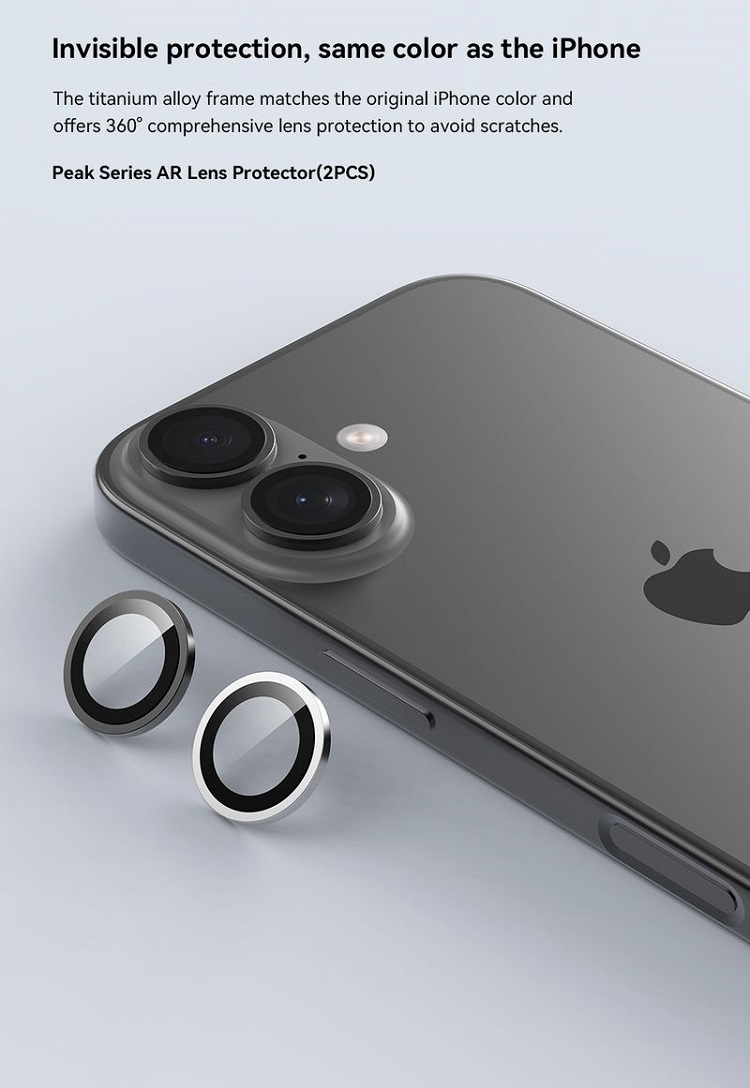 Folie Sticla Camera Peak Series iPhone 17, pachet de 2 buc de la Devia, este fabricata din sticla premium cu o margine din aliaj de titan si ofera o protectie suplimentara impotriva zgarieturilor si murdariei.