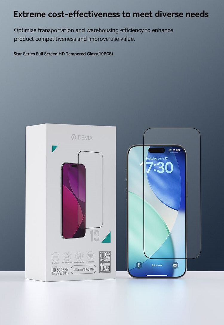Folie Sticla Star Series Full Screen HD iPhone 17 Pro Max, pachet de 10 buc de la Devia, este o folie din sticla temperata (securizata), rezistenta la zgarieturi si socuri.