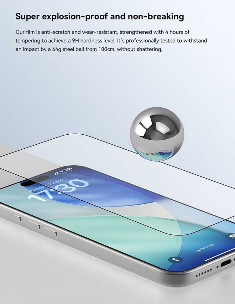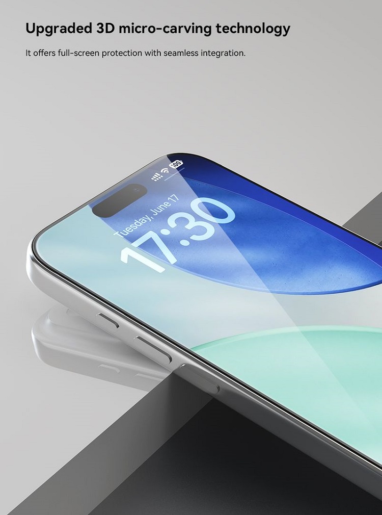 Folie Sticla Star Series Full Screen HD iPhone 17 Pro / iPhone 17 / iPhone 16 Pro pachet de 10 buc de la Devia, este o folie din sticla temperata (securizata), rezistenta la zgarieturi si socuri. Ofera protectie de lunga durata si acopera ecranul in totalitate. Rama neagra discreta se aliniaza perfect cu designul dispozitivului, iar stratul oleofobic previne amprentele si petele.