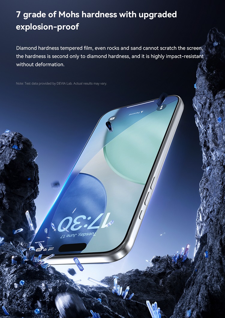 Folia Sticla Van Series Crystal Diamond iPhone 17 Pro Max de la Devia, este o folie din sticla (securizata) ce ofera rezistenta la zgarieturi, socuri si amprente. Tehnologia Crystal Diamond imbunatateste durabilitatea si ofera o transparenta perfecta pentru o experienta vizuala clara si fidela.