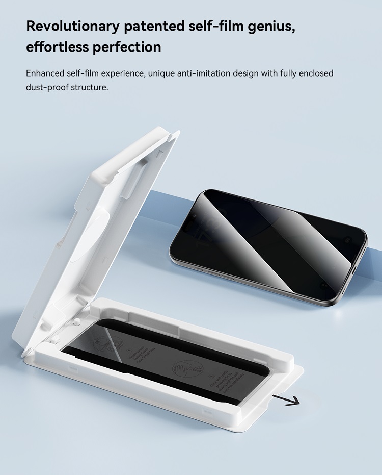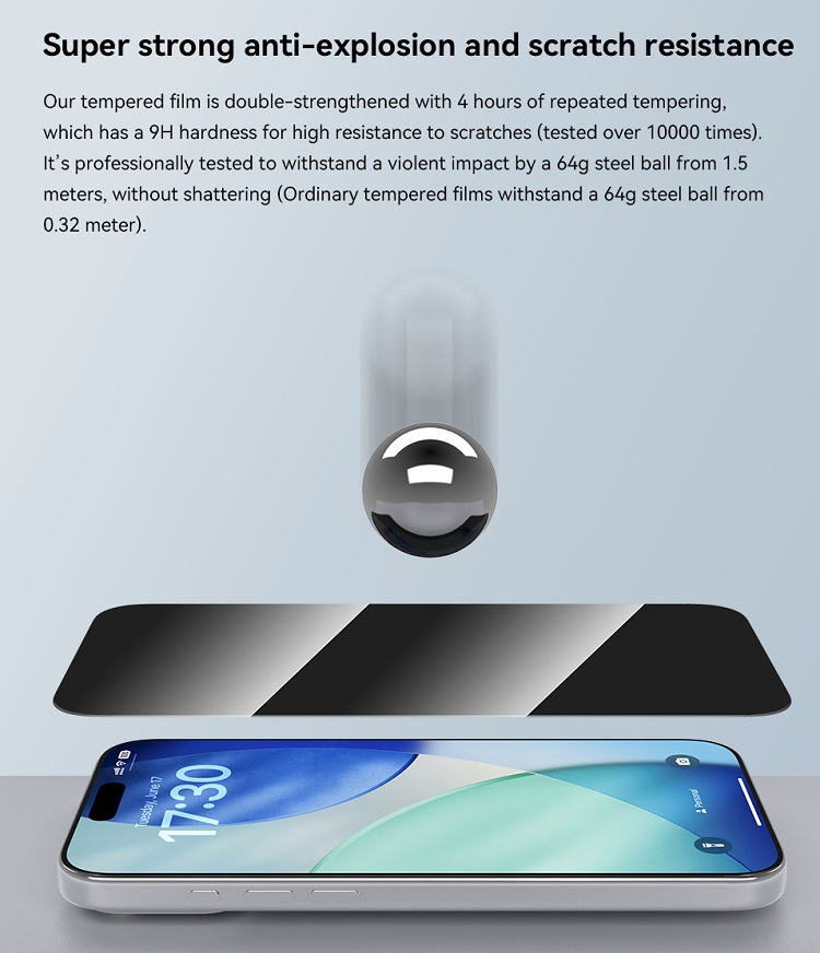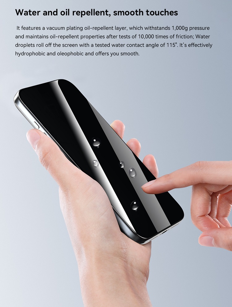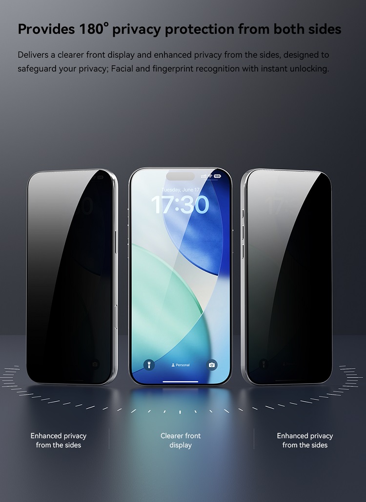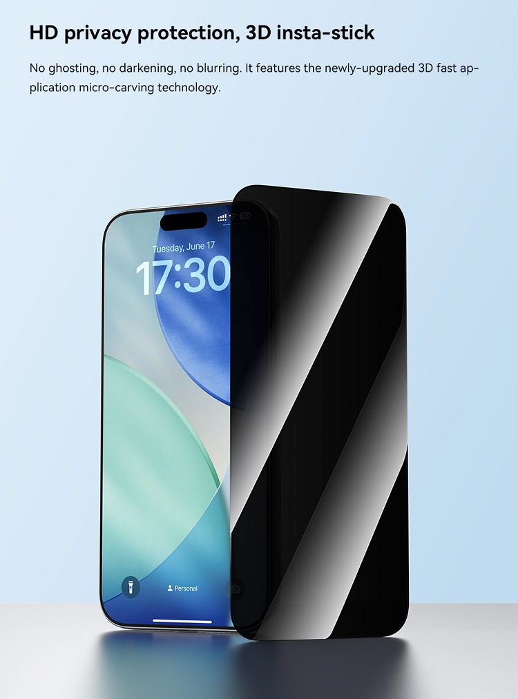 Folia de Sticla Van Series Full Screen Privacy, cu kit special de montare de la Devia pentru iPhone 17 Pro Max este o folie premium din sticla temperata (securizata), foarte rezistenta la zgarieturi si socuri si rezista la temperaturi mari si are un strat de protectie oleofobic care protejeaza impotriva petelor.