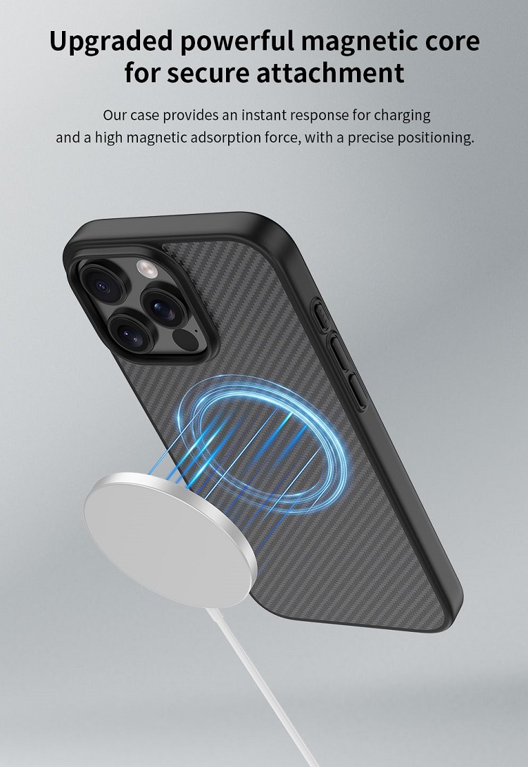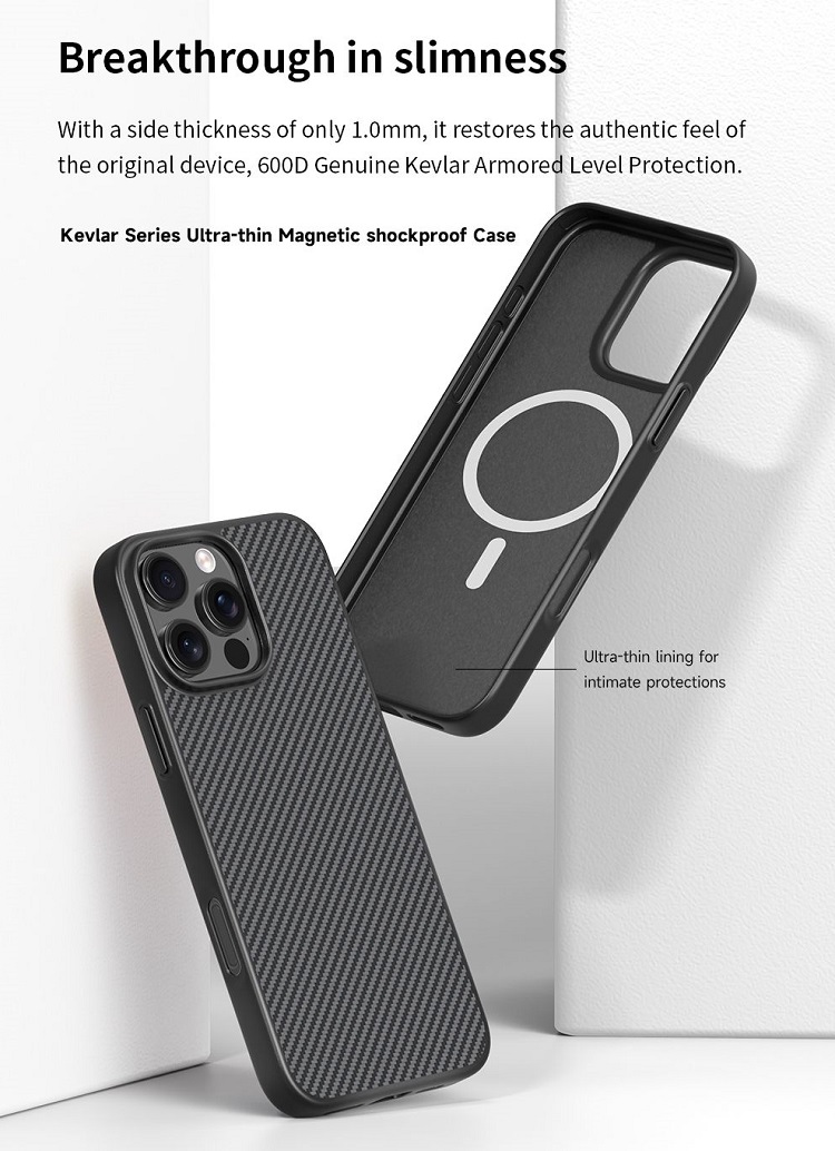 Husa Kevlar Series Ultra-thin MagSafe Shockproof iPhone 16 Pro Max de la Devia, este realizata din materiale durabile ce protejaza telefonul dumneavoastra de uzura zilnica si de lovituri, prevazuta cu magneti incorporati imbunatatiti pentru compatibilitatea MagSafe.