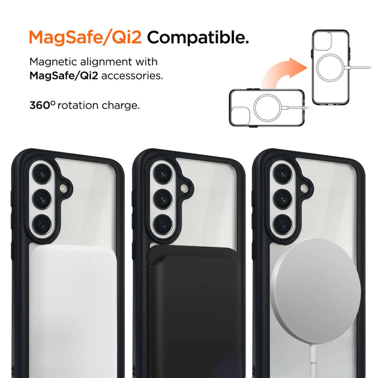 Husa dispune de doua sloturi interioare pentru carduri, oferind confortul unui portofel compact. Compatibilitatea MagSafe permite incarcare wireless rapida si utilizarea accesoriilor magnetice fara a scoate husa.