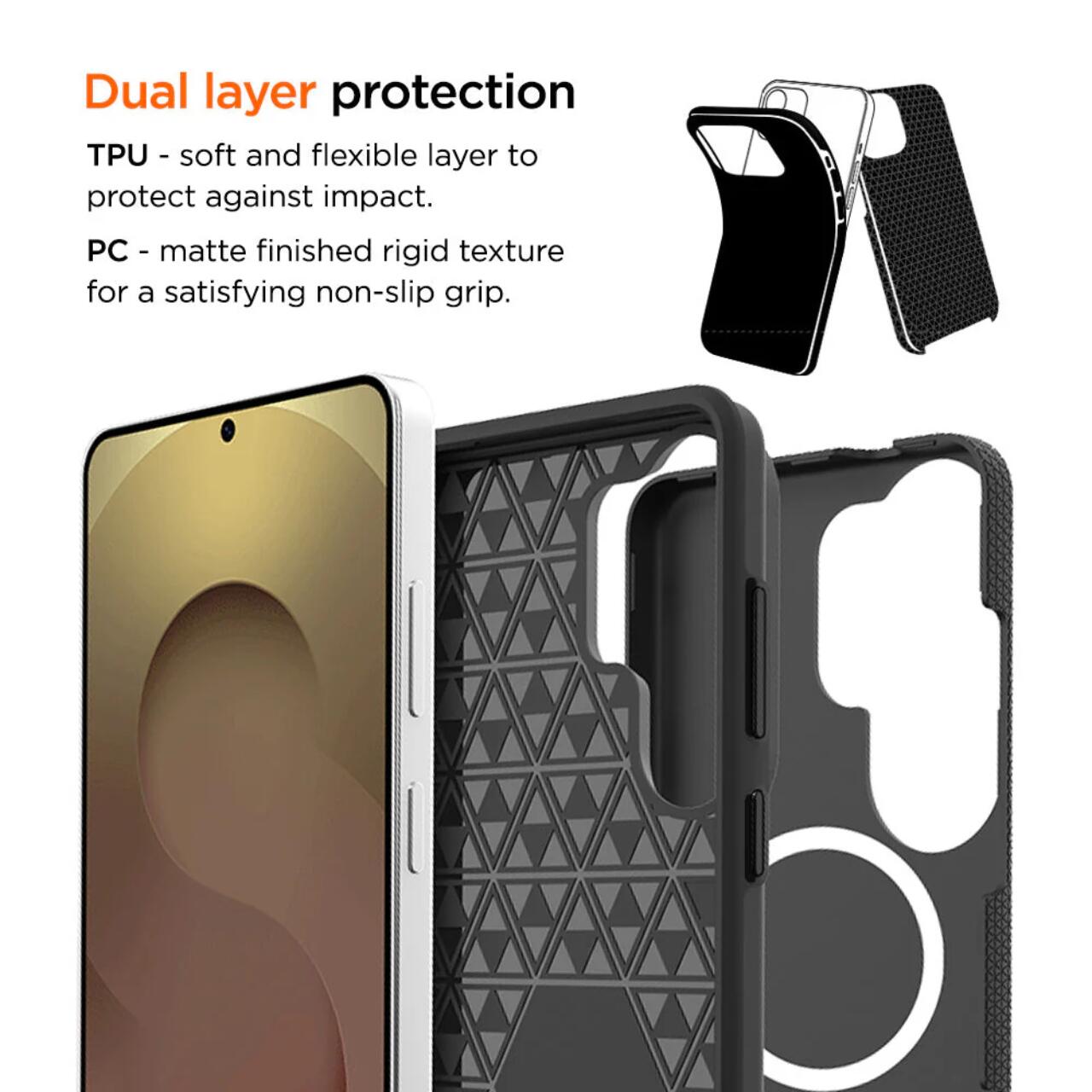 Husa North Magsafe GRS pentru Samsung Galaxy S26 Ultra de la Eiger, este realizata dintr-un material durabil, avand la interior un strat din TPU rezistent la socuri iar la exterioar policarbonat, ambele oferind protectie optima impotriva zgarieturilor si caderilor accidentale. Textura mata si confortabila a husei asigura o prindere sigura si anti-alunecare, iar butoanele negre de protectie integrate adauga un finisaj premium dispozitivului.