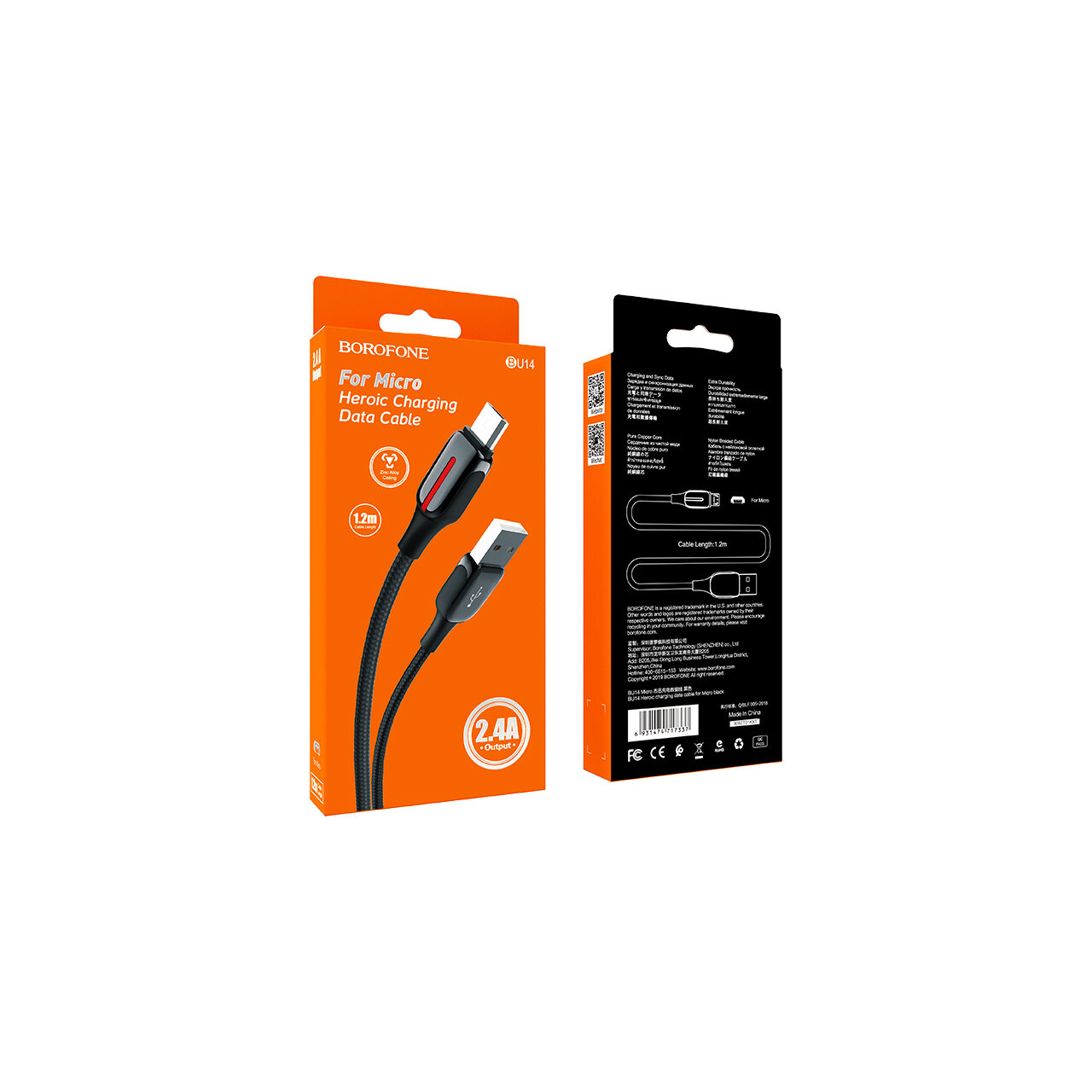The BU14 Heroic USB to MicroUSB cable from Borofone is made of durable, damage-resistant material, which ensures long and safe use. The cable has been placed in a strong nylon braid, and the zinc alloy plugs are resistant to abrasion and oxidation .