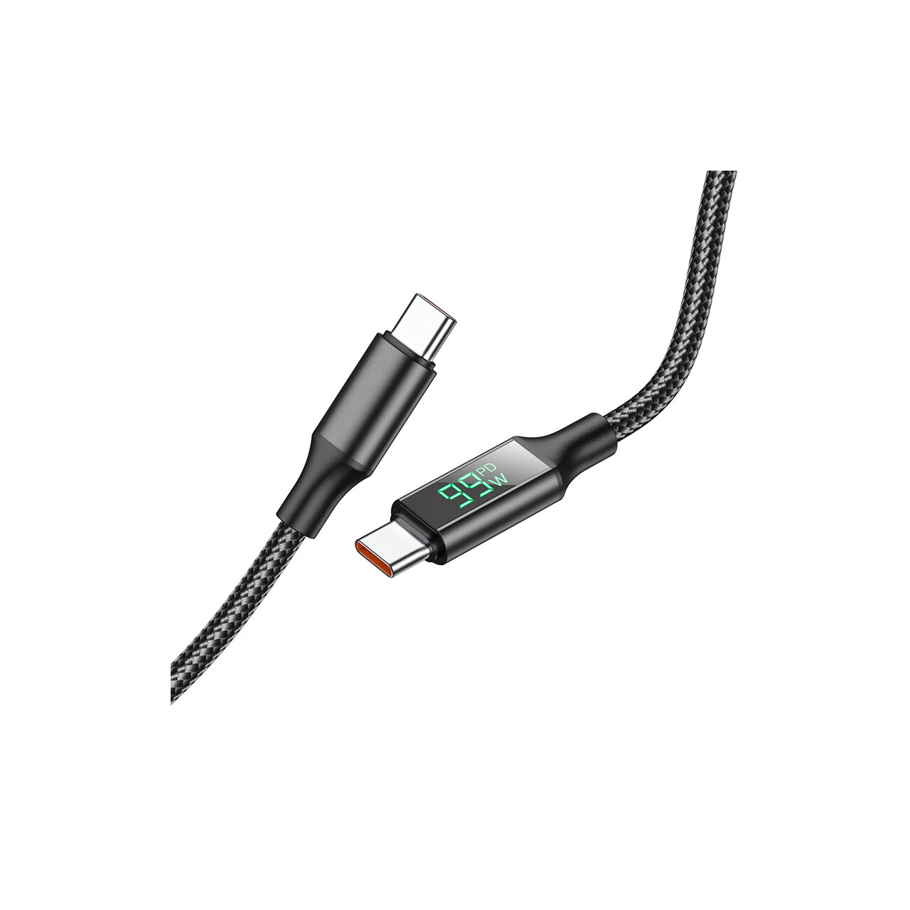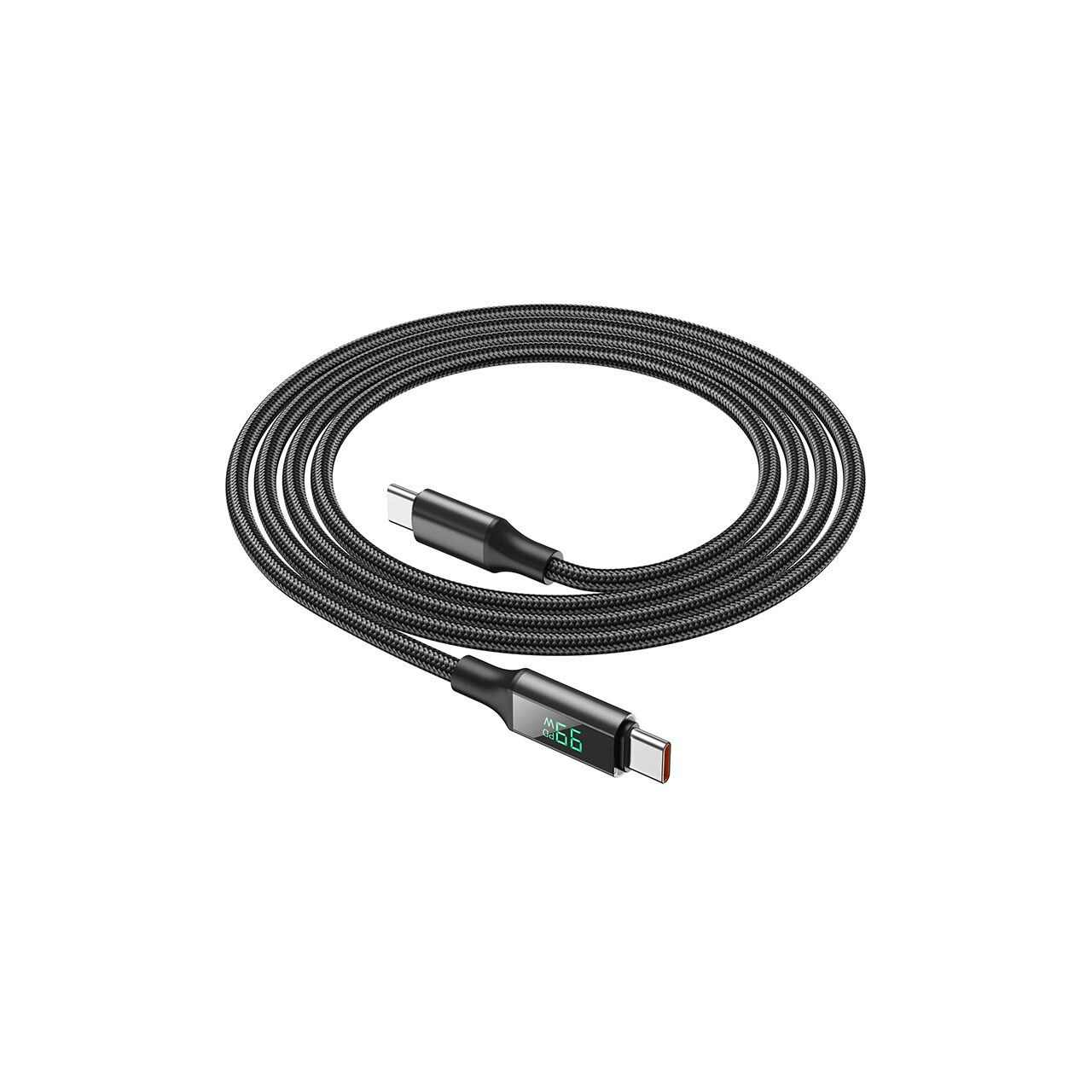 It is dressed in a strong nylon braid, aluminum plugs resistant to wear and oxidation, with real-time digital display of charging power, when PD is fast charging (voltage exceeds 6V), the word PD will be displayed, and with a charger adequate, it can support up to 100 W (20 V/5 A).