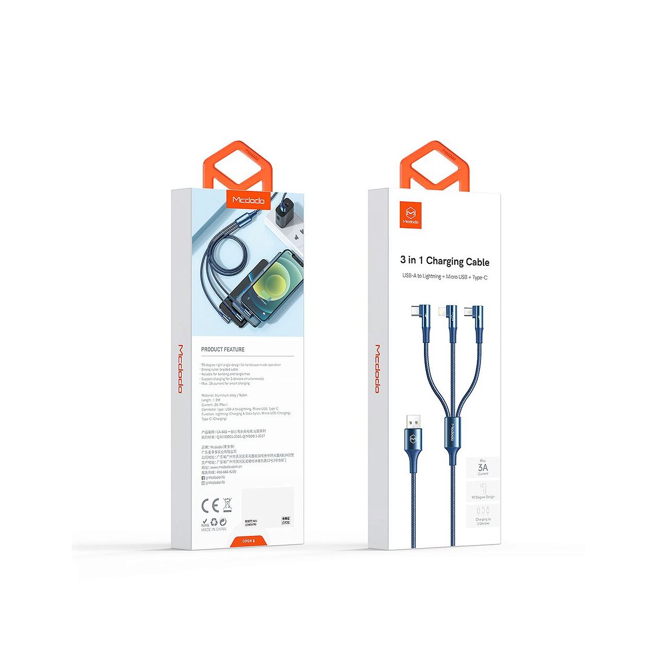 The 3 in 1 90 Degree Lightning & MicroUSB & Type-C cable from Mcdodo can be used both for charging and data synchronization together with devices with Lightning, Type-C and MicroUsb connectors.