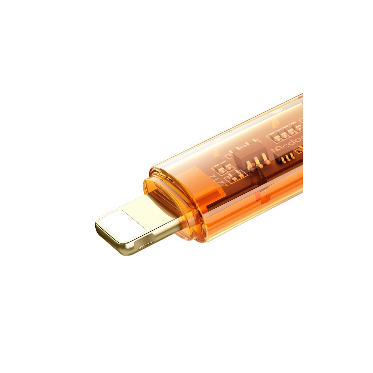 Amber Series Fast Charging Type-C to Lightning cable from Mcdodo with transparent connector design, to clearly see the circuit components, absolutely striking cable and supports 36W fast charging and 480Mbps data transmission.