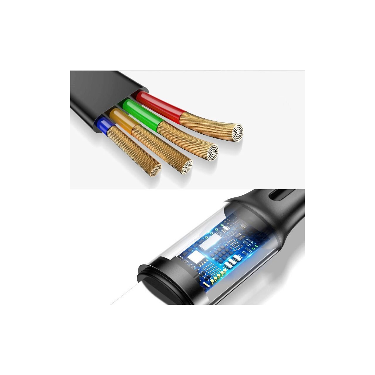 The USB, MicroUSB, Lightning and Type-C plugs have aluminum alloy casings and an elegant design, the connection with the cable having an SR type reinforcement. There is a circular LED on the wire that helps to identify the cable in the dark, but at the same time informs the user that it is connected and ready for charging.