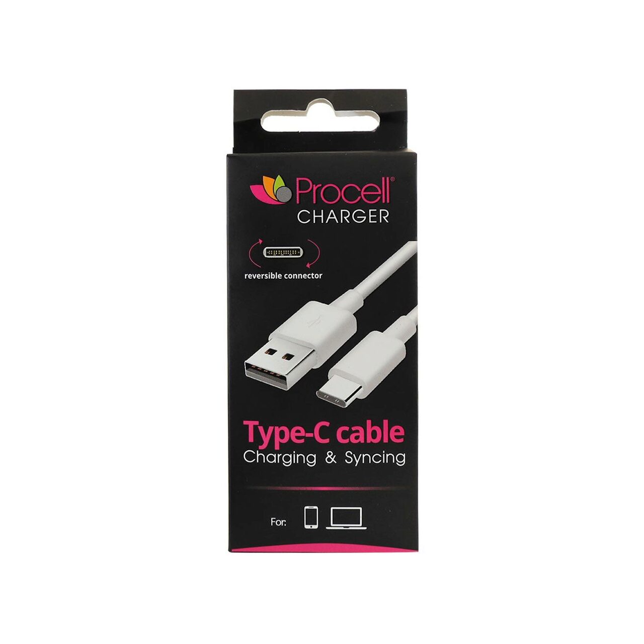 The Procell cable allows both charging and data transfer for phones and tablets with a Type-C (USB-C) plug.