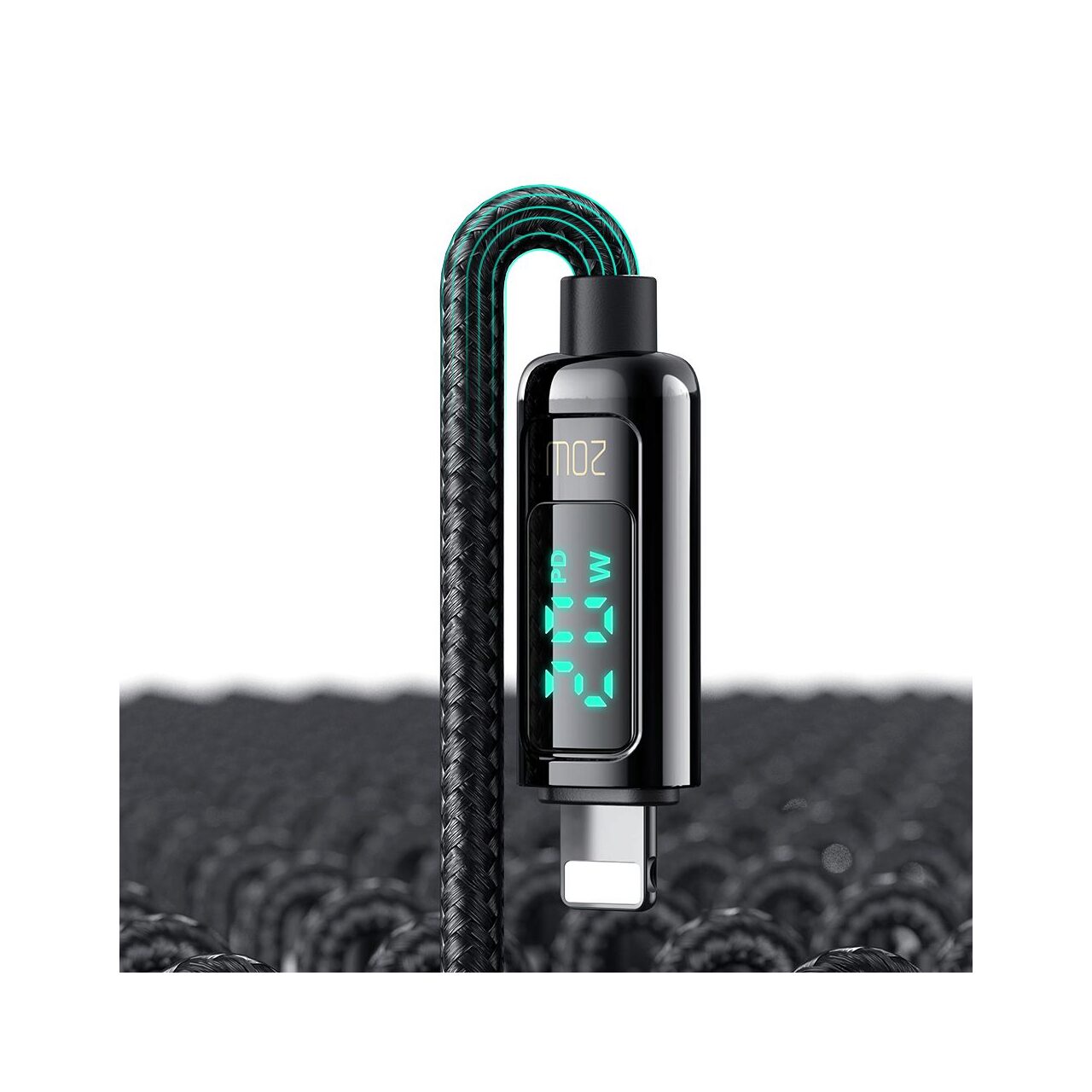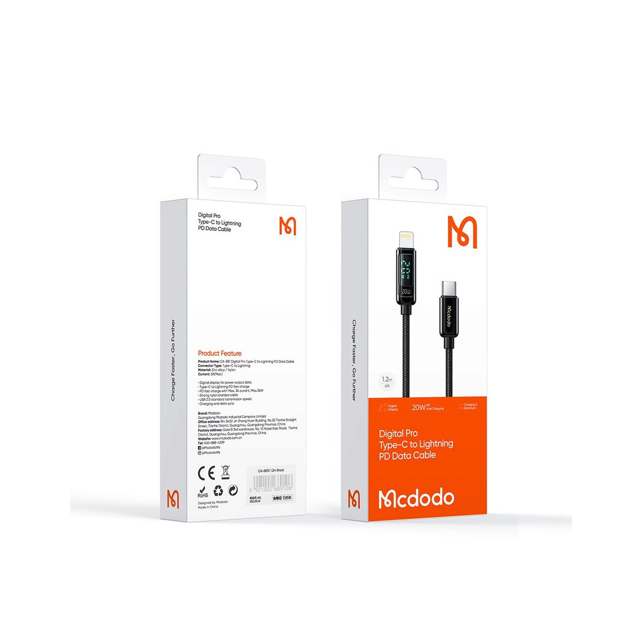 Charging cable from Mcdodo Digital Pro Type-C to Lightning with nylon braid for phones and tablets, with a length of 1.2 meters, textile coating (anti-trampling) along the entire length and protections for anti-corrosive Gold zinc alloy plugs, with silicone link extensions for better durability.