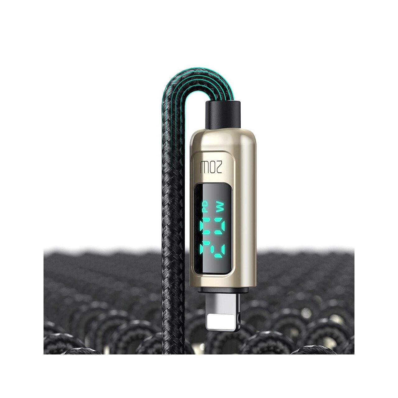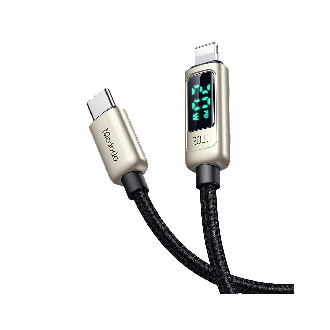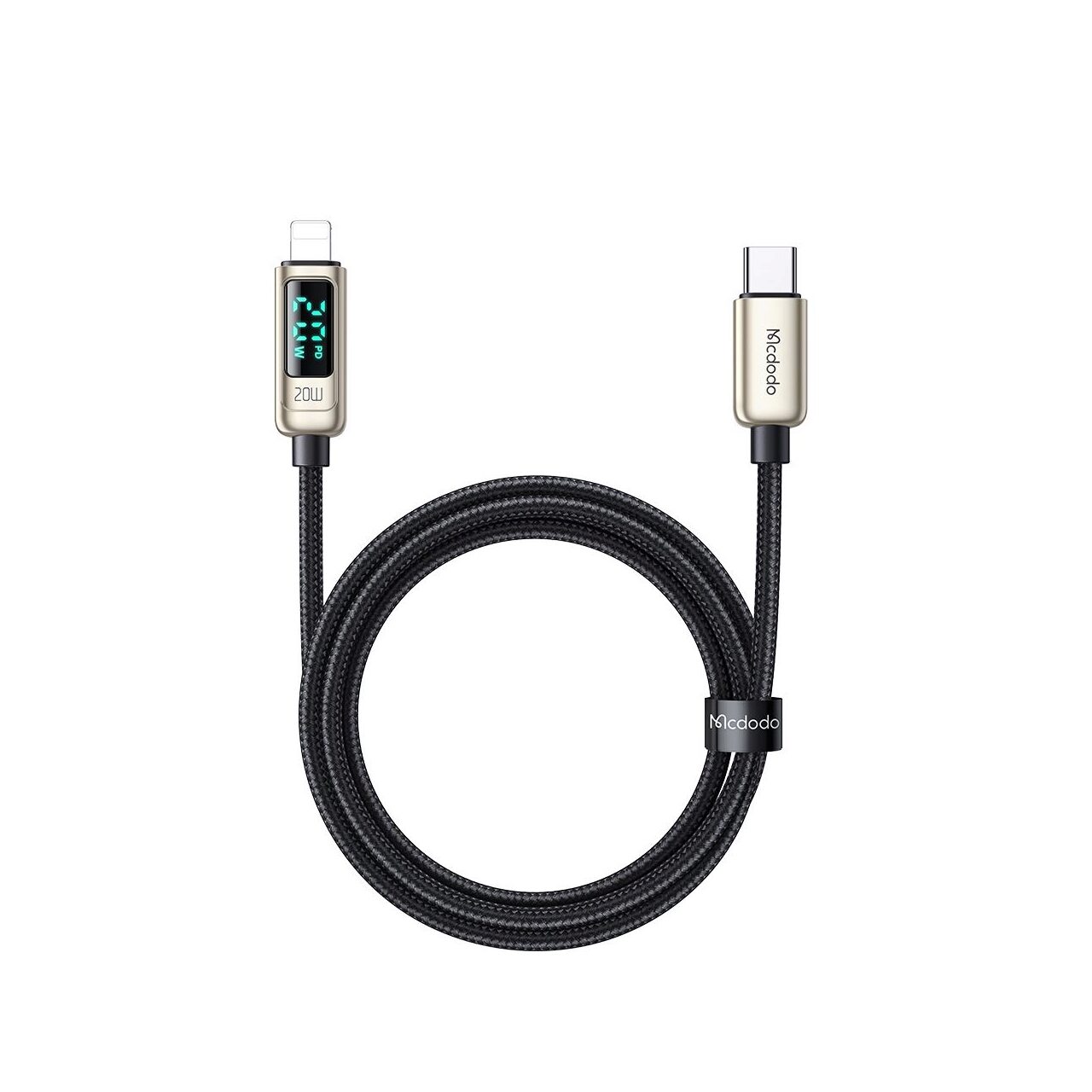 Charging cable from Mcdodo Digital Pro Type-C to Lightning with nylon braid for phones and tablets, with a length of 1.2 meters, textile coating (anti-trampling) along the entire length and protections for anti-corrosive Gold zinc alloy plugs, with silicone link extensions for better durability.