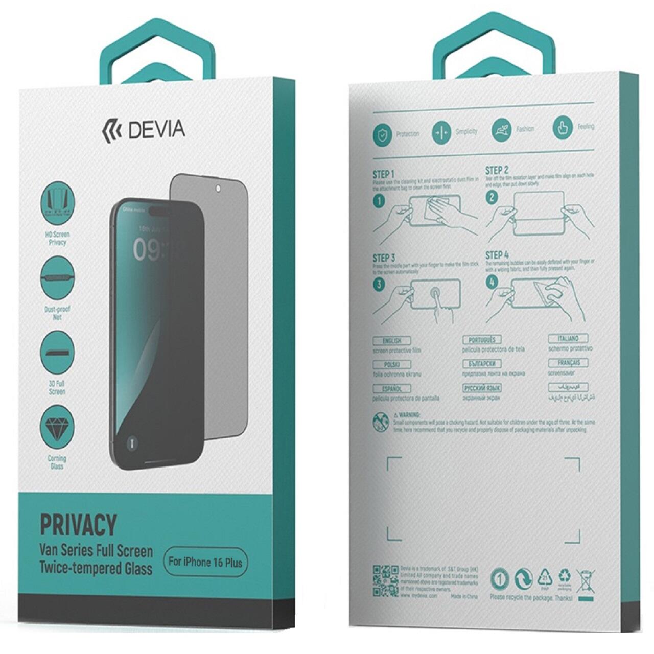 Devia Folie Sticla Van Series Full Screen Privacy Twice iPhone 16 Plus Negru