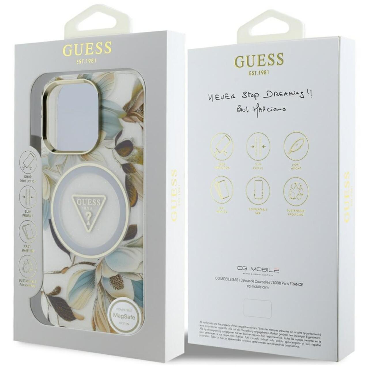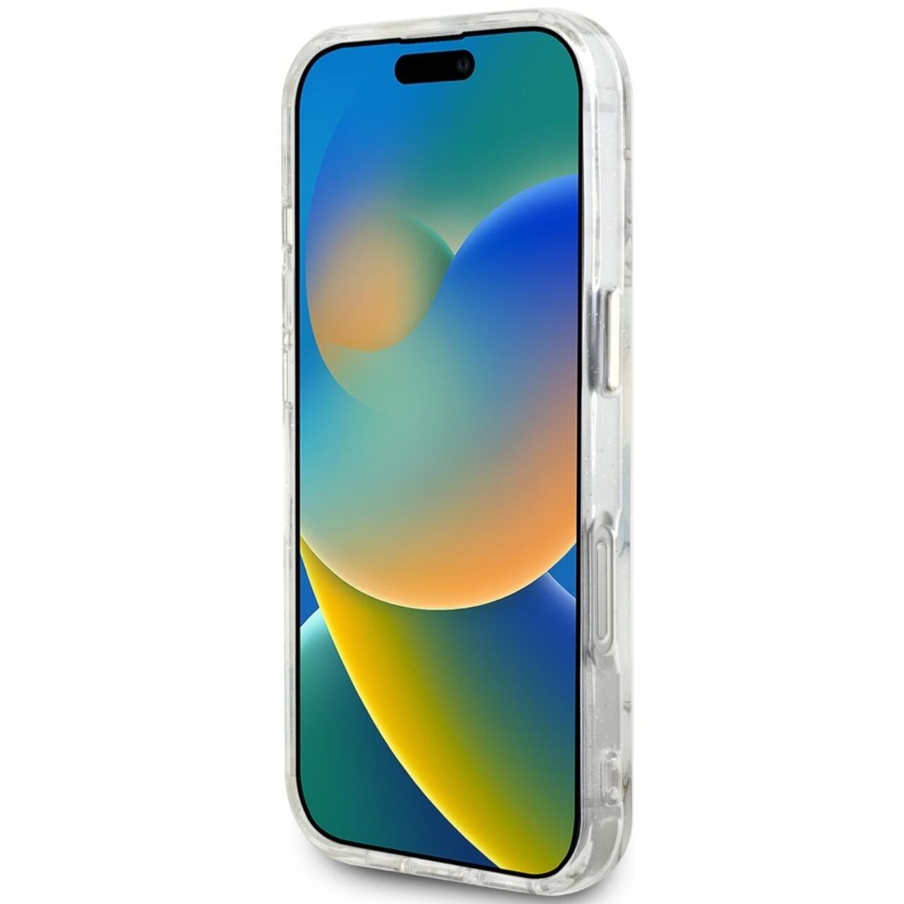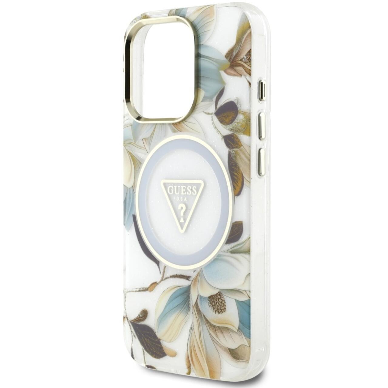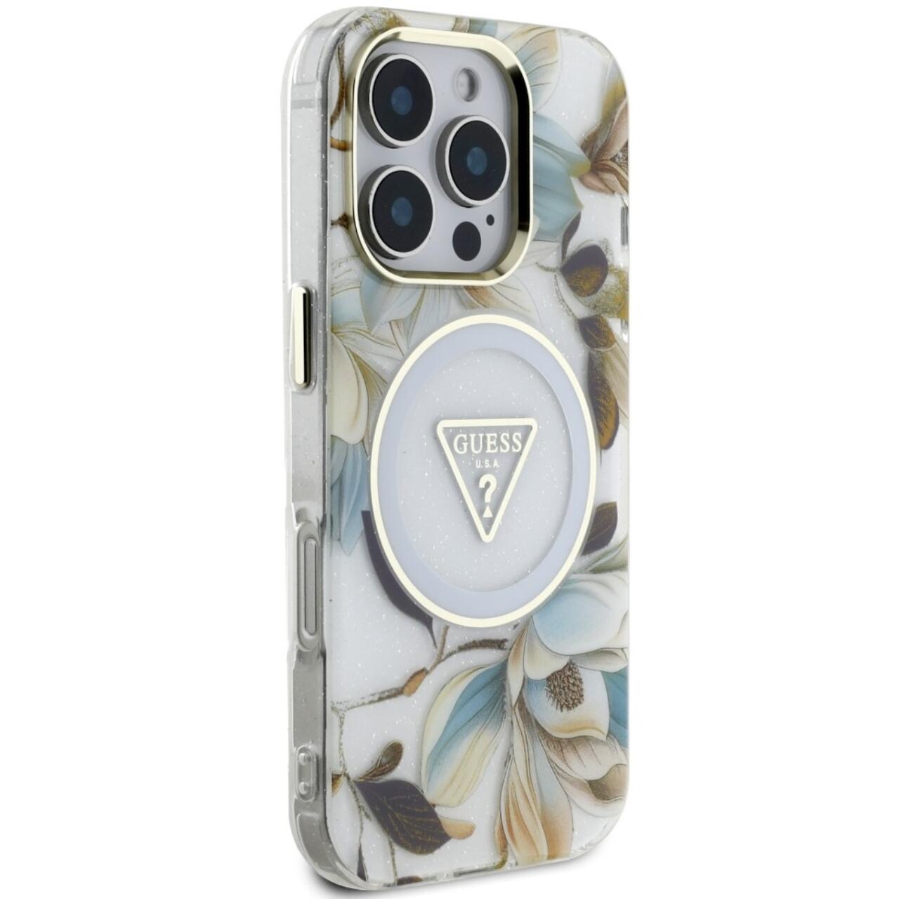 Guess Husa Glitter Flowers Triangle Buttons MagSafe iPhone 16 Pro Max Alb