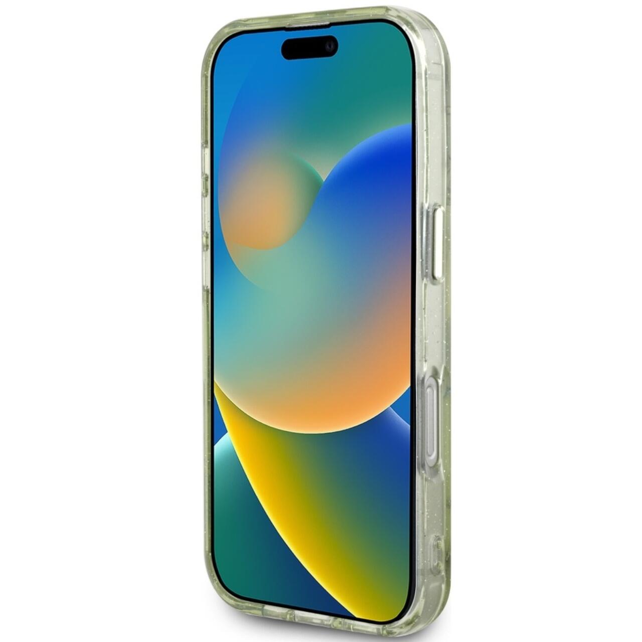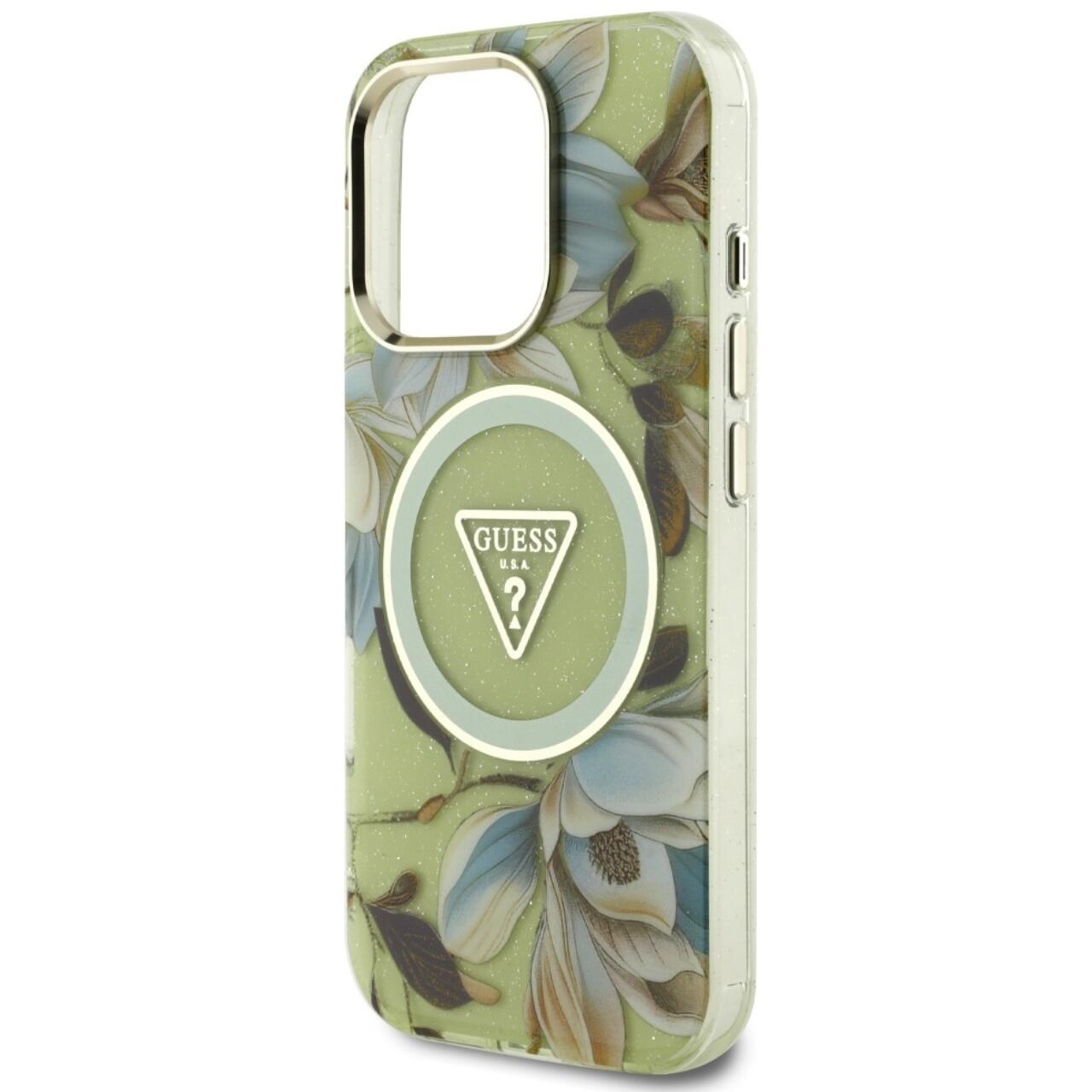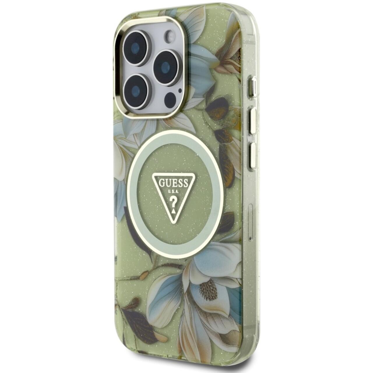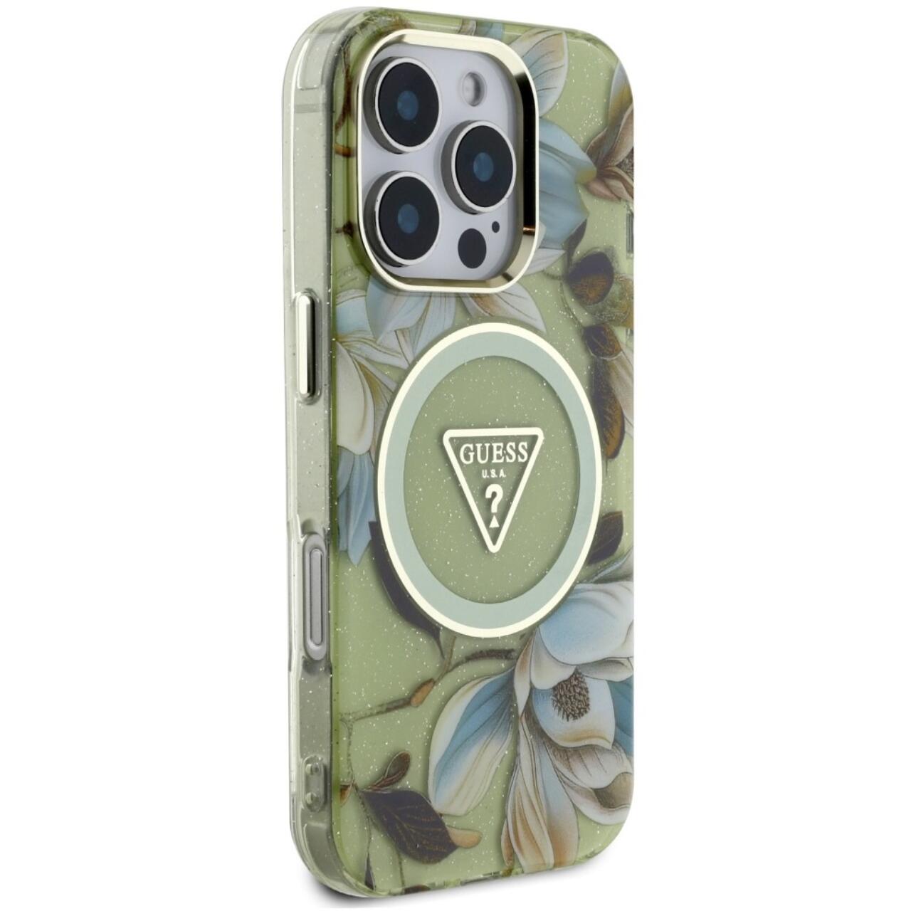 Guess Husa Glitter Flowers Triangle Buttons MagSafe iPhone 16 Pro Max Verde