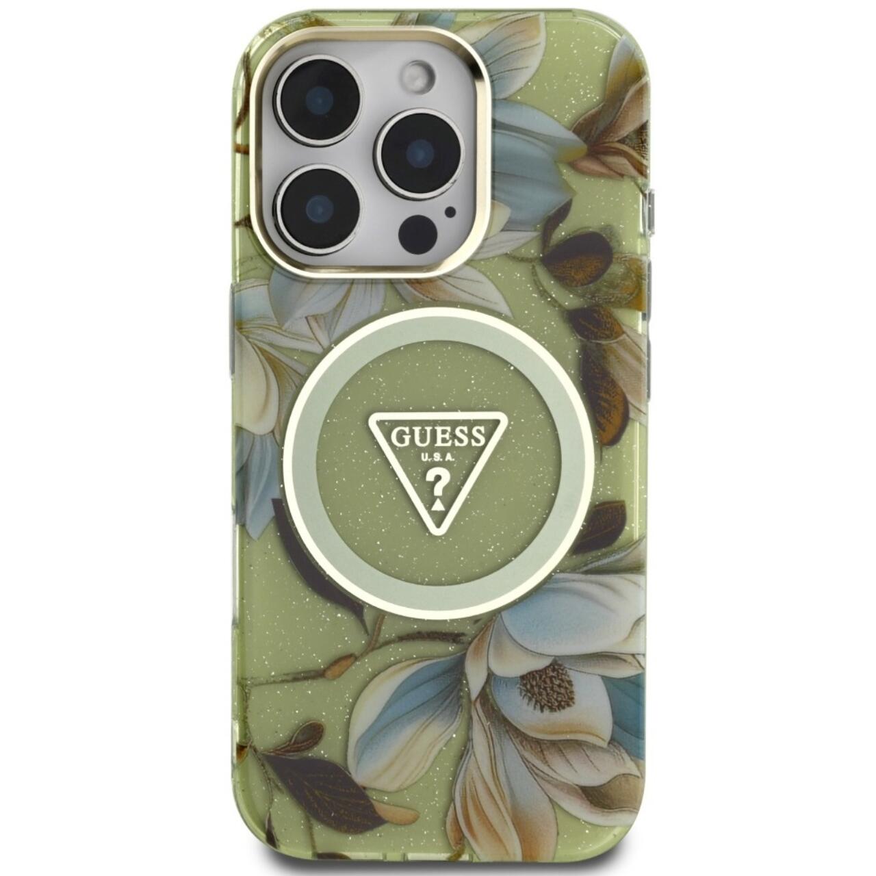 Guess Husa Glitter Flowers Triangle Buttons MagSafe iPhone 16 Pro Verde