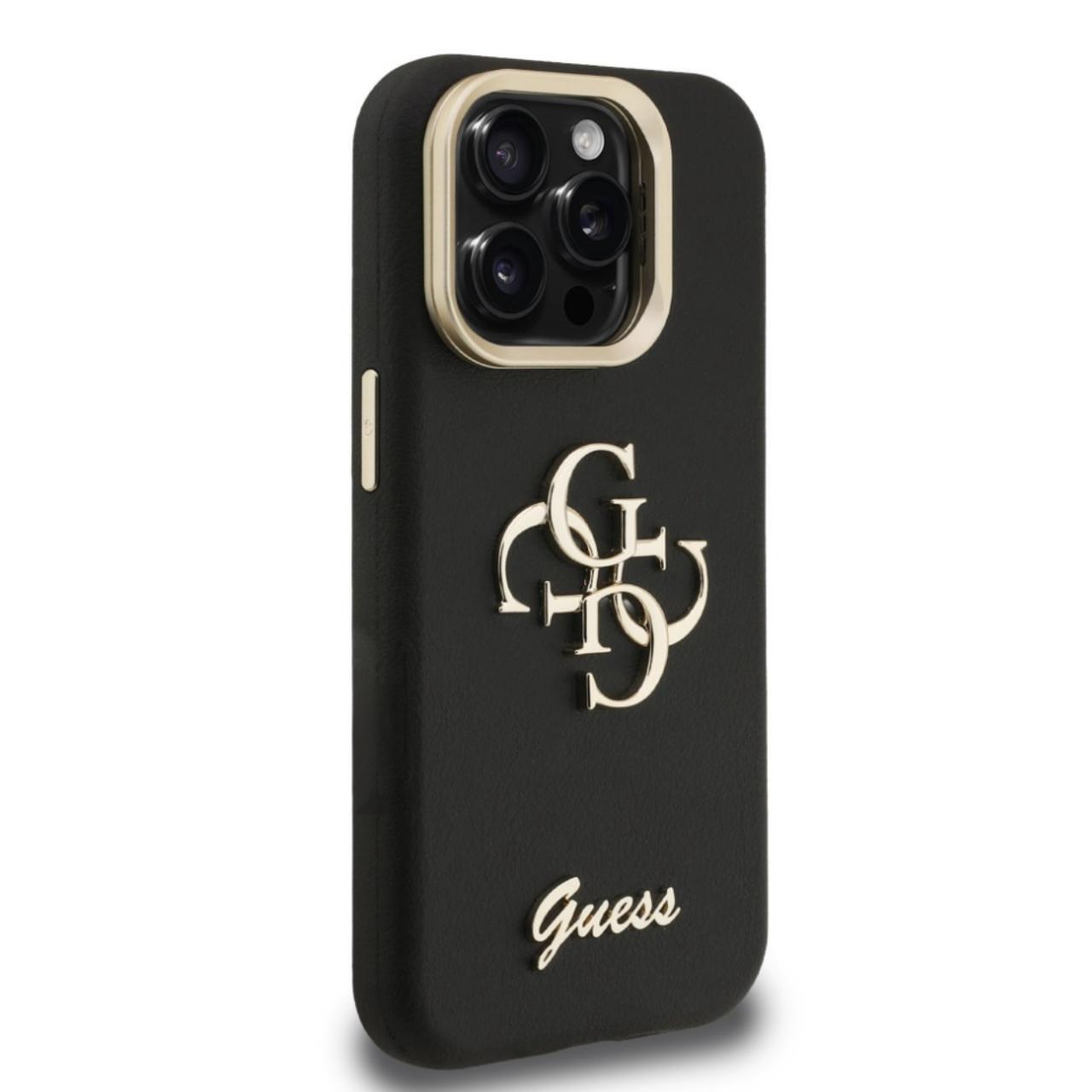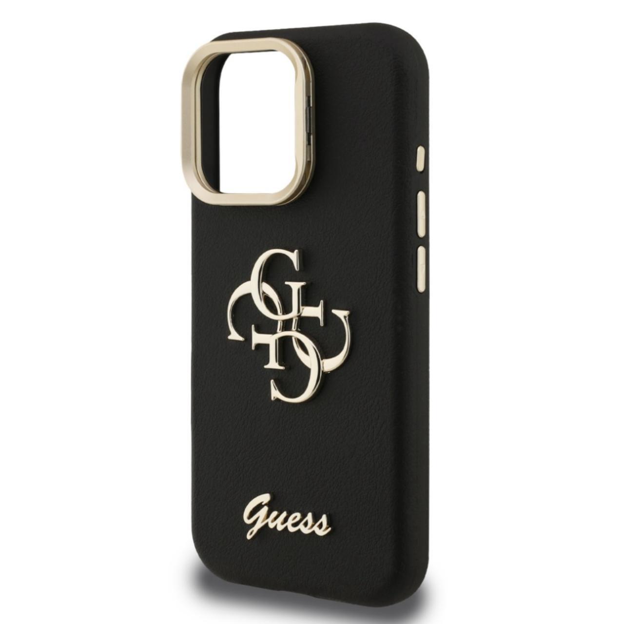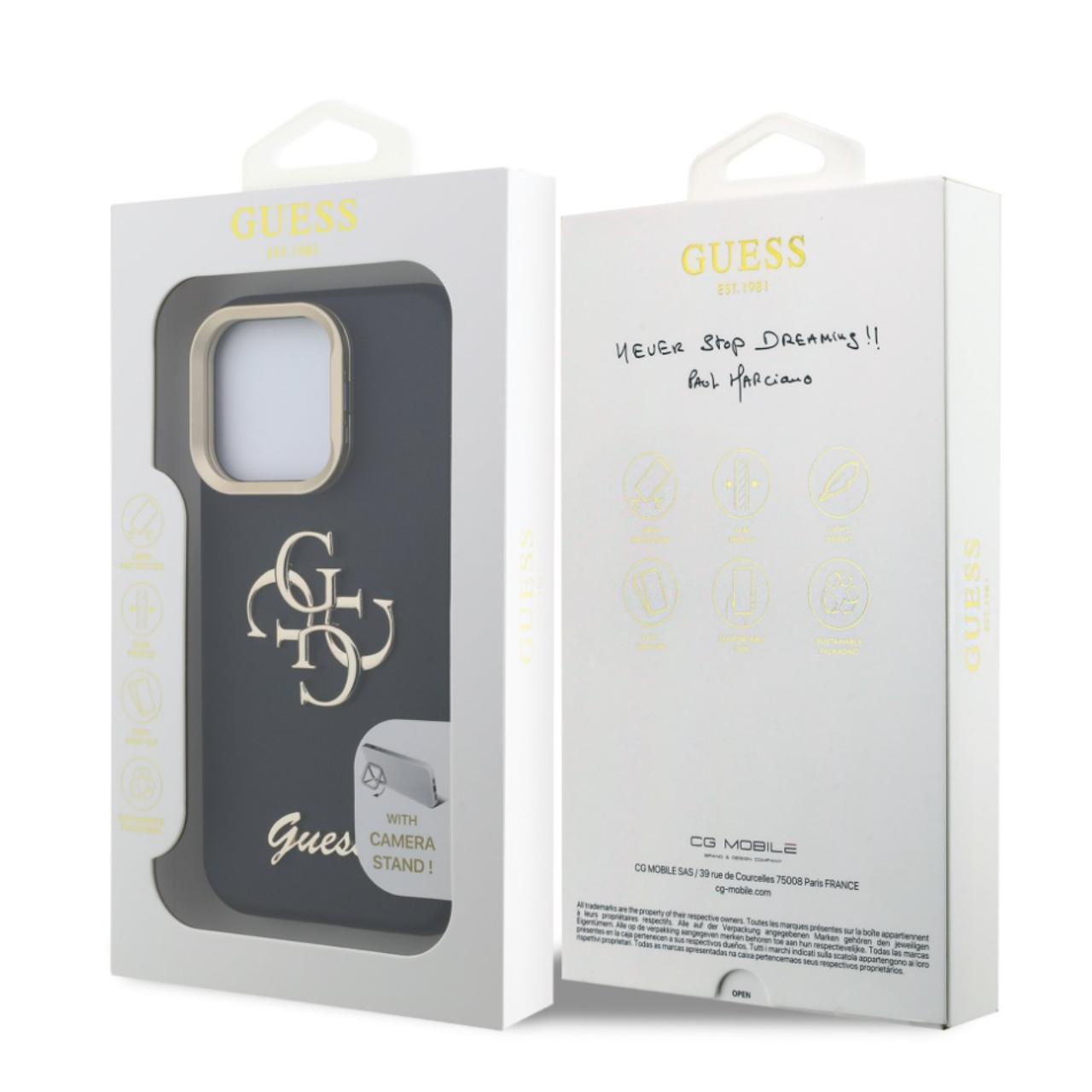 Guess Husa Grained 4G Logo Stand Camera Frame iPhone 15 Pro Max Negru