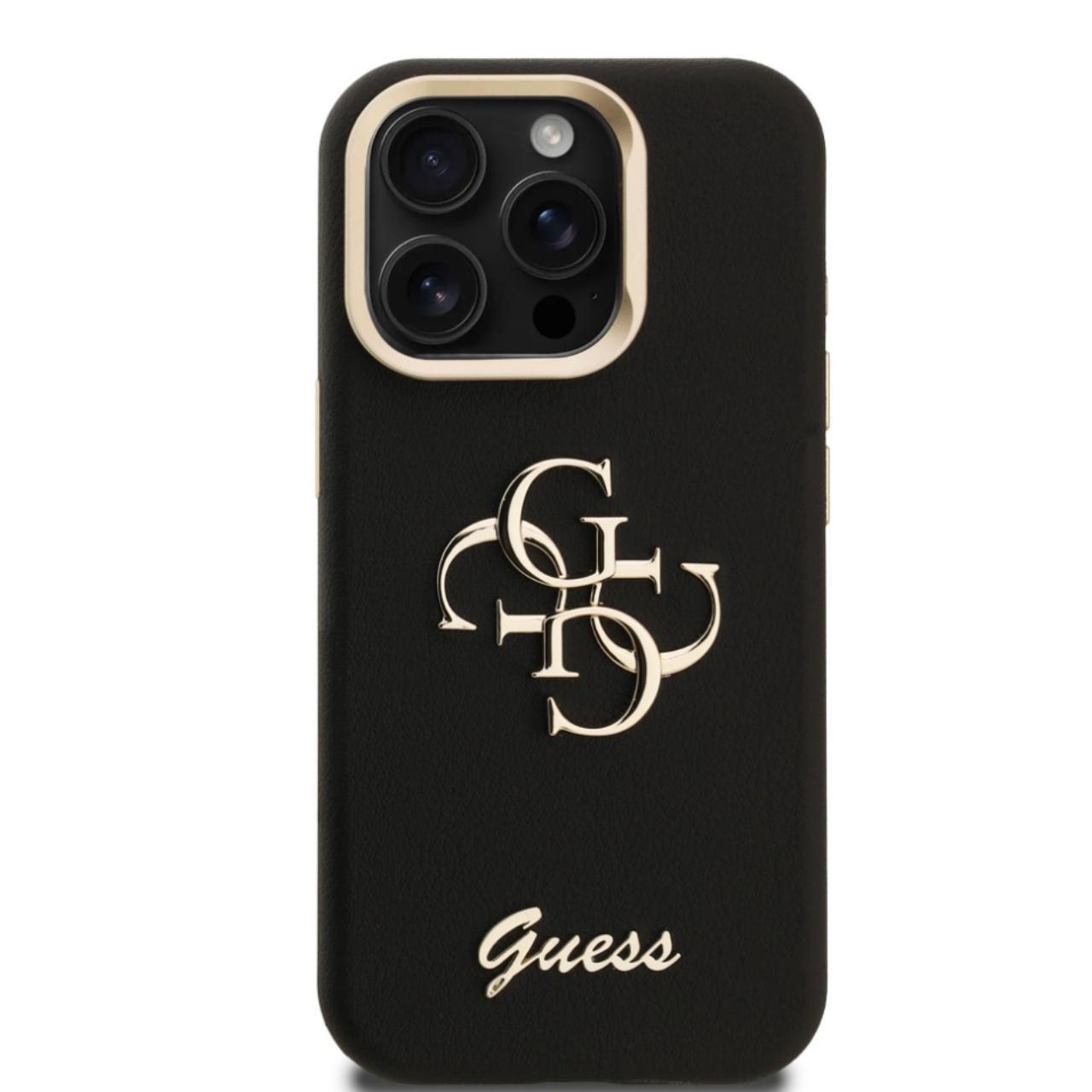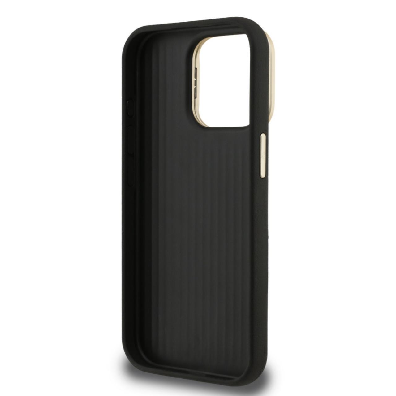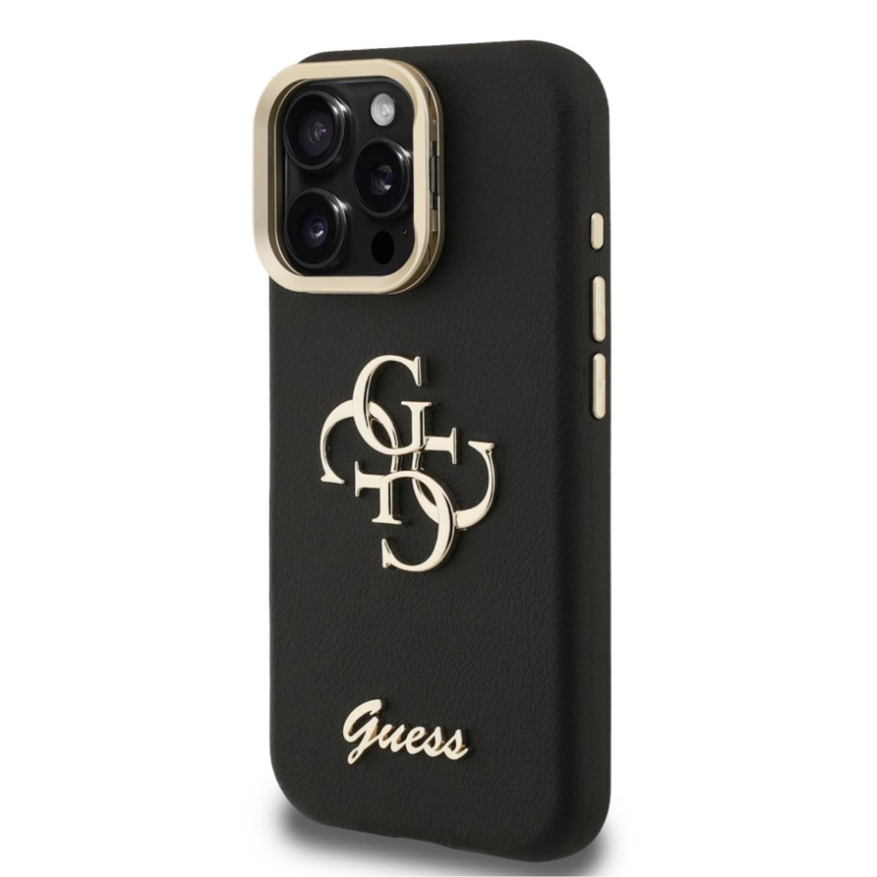 Guess Husa Grained 4G Logo Stand Camera Frame iPhone 15 Pro Max Negru