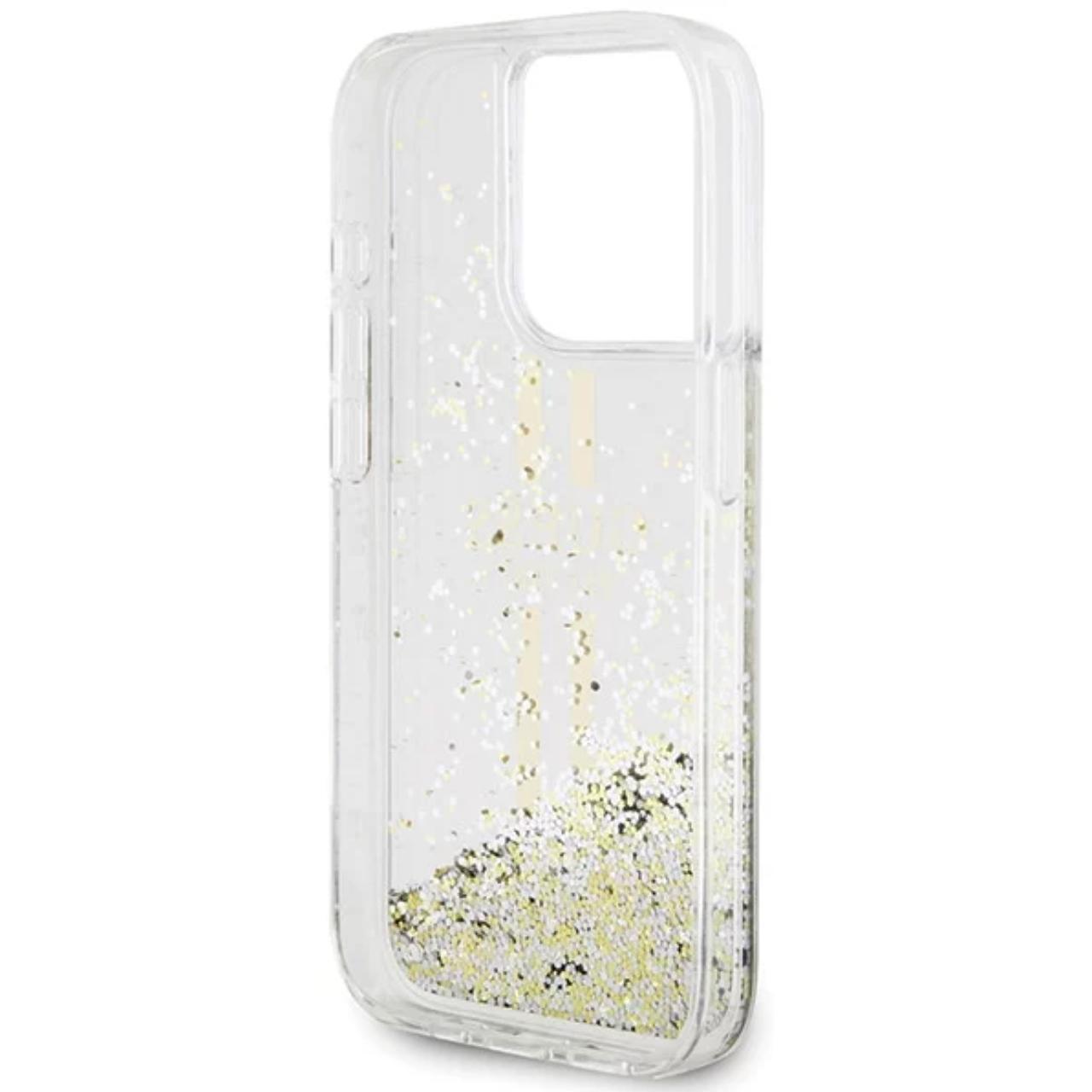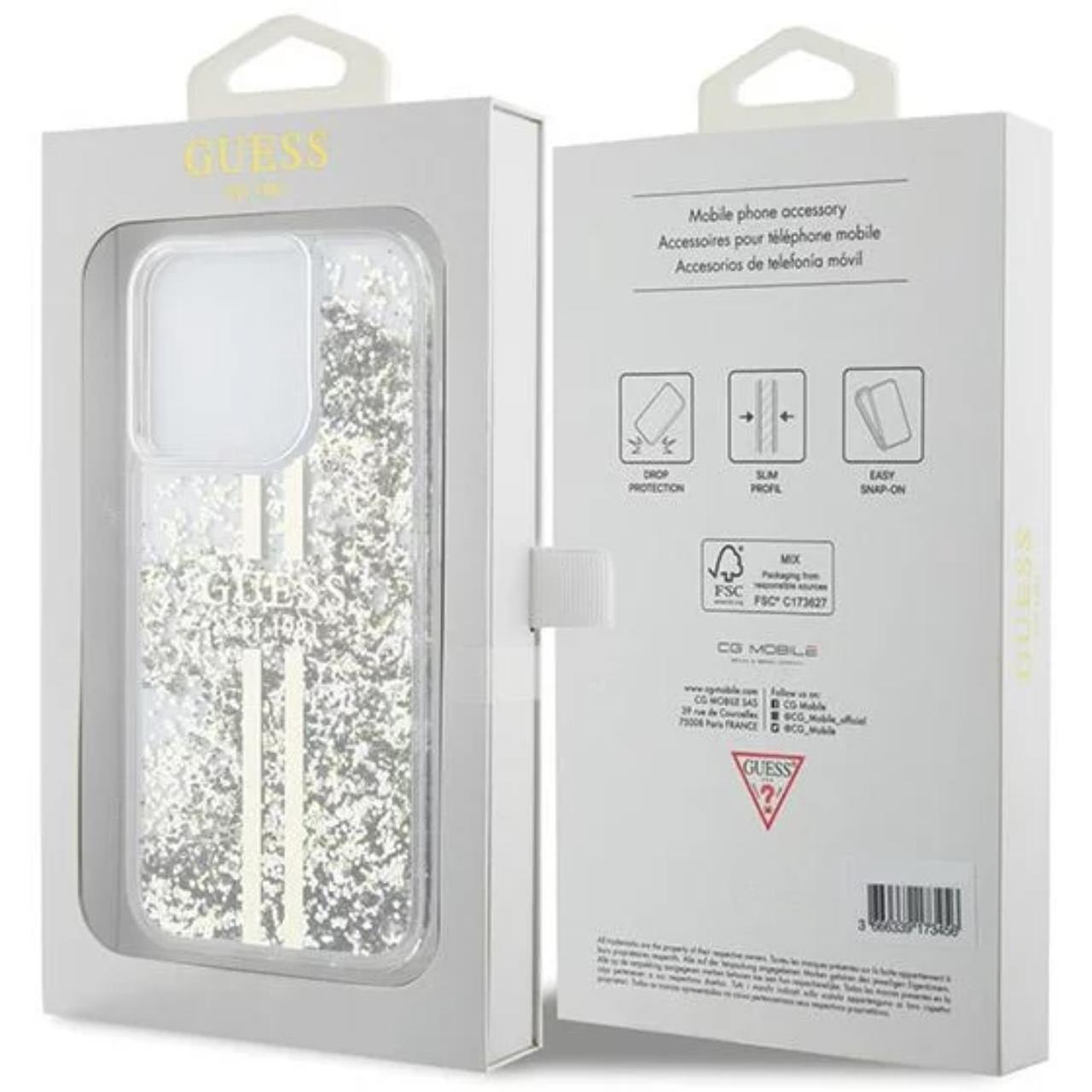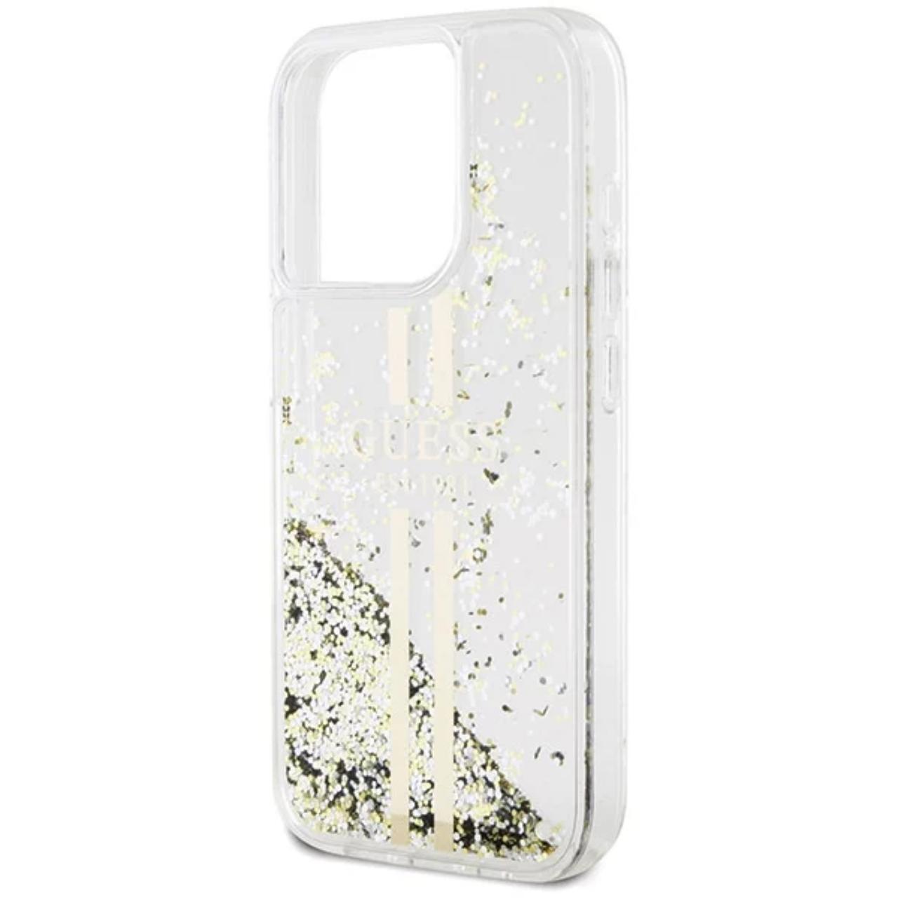 Guess Husa Liquid Glitter Gold Stripe iPhone 15 Pro Transparent
