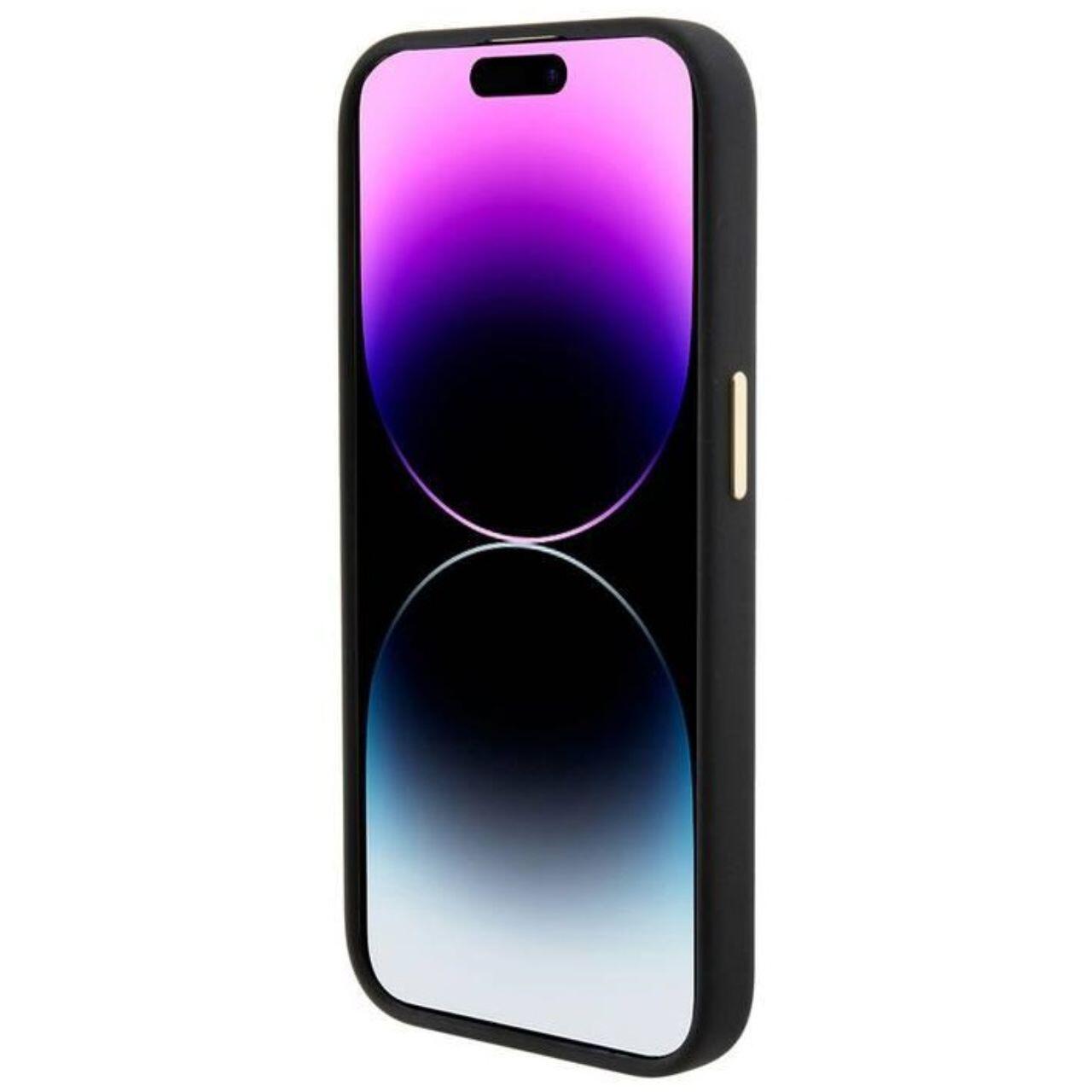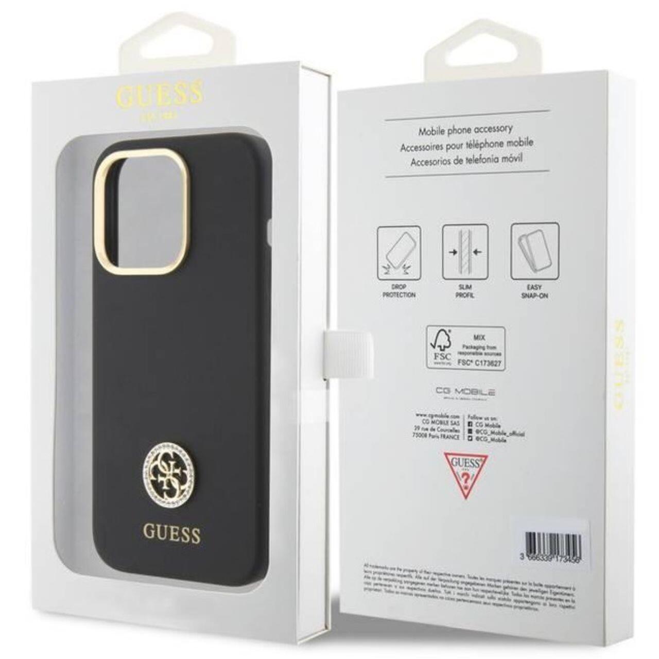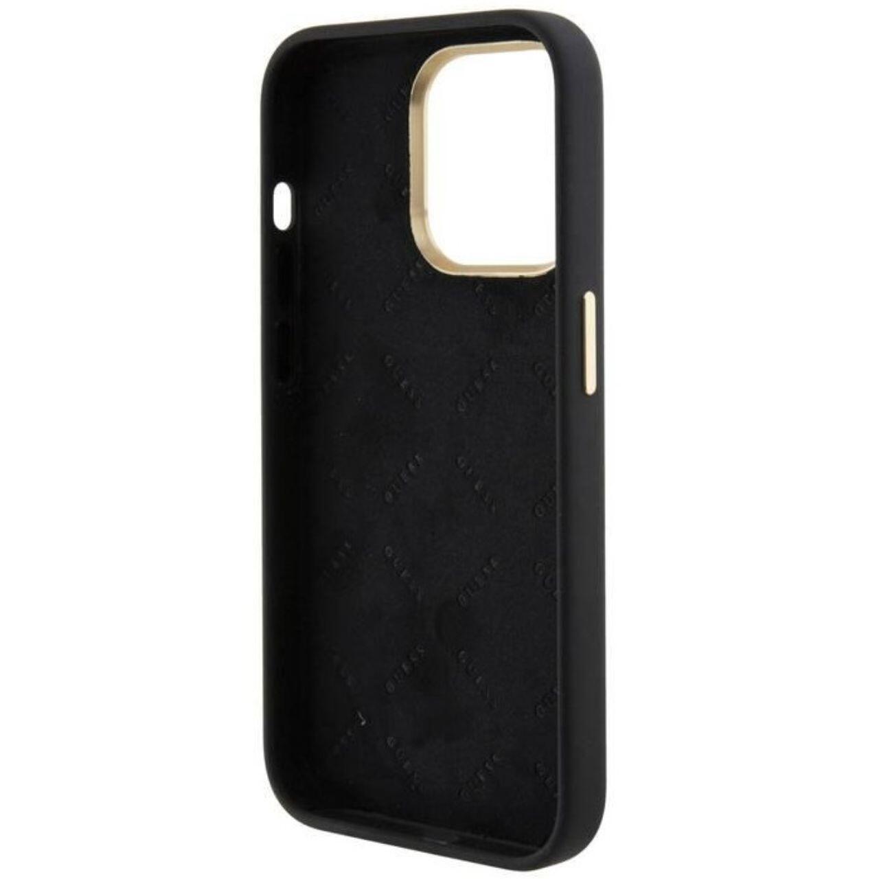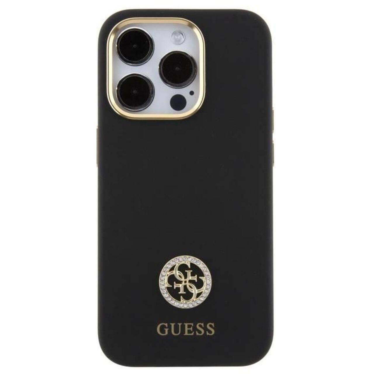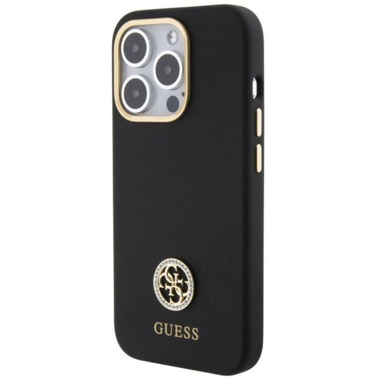 Guess Husa Liquid Silicone 4G Strass Metal Logo iPhone 15 Pro Negru