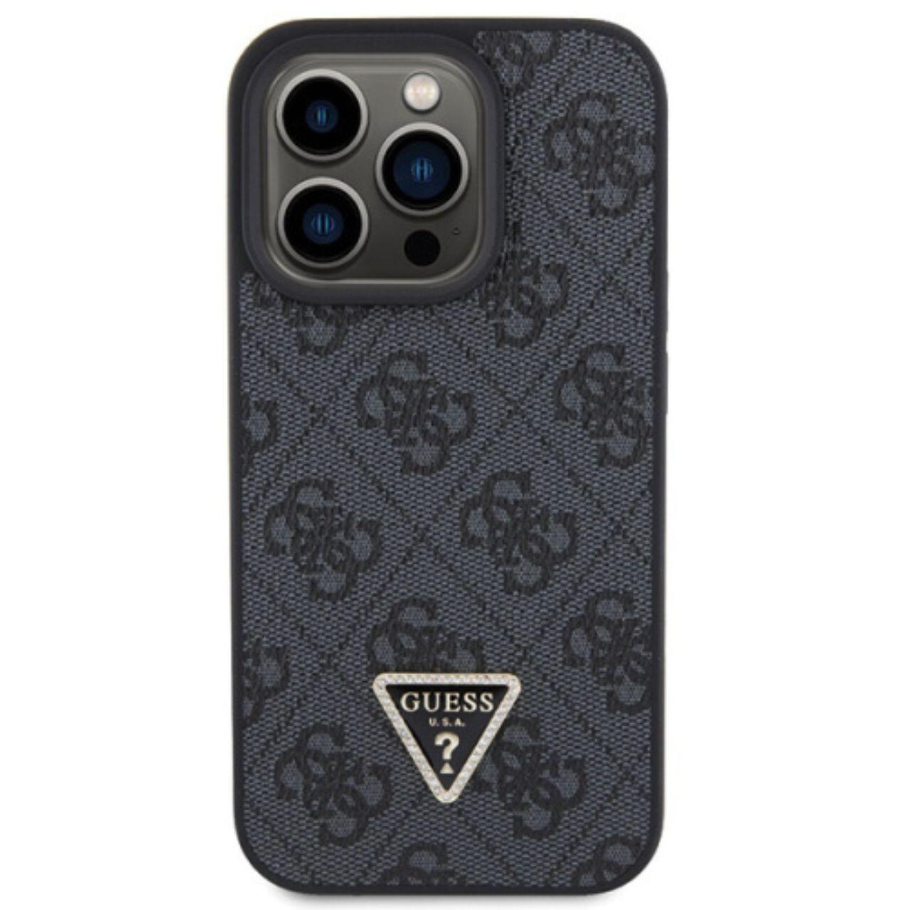 Guess Husa PU 4G Strass Triangle Metal Logo iPhone 15 Pro Negru