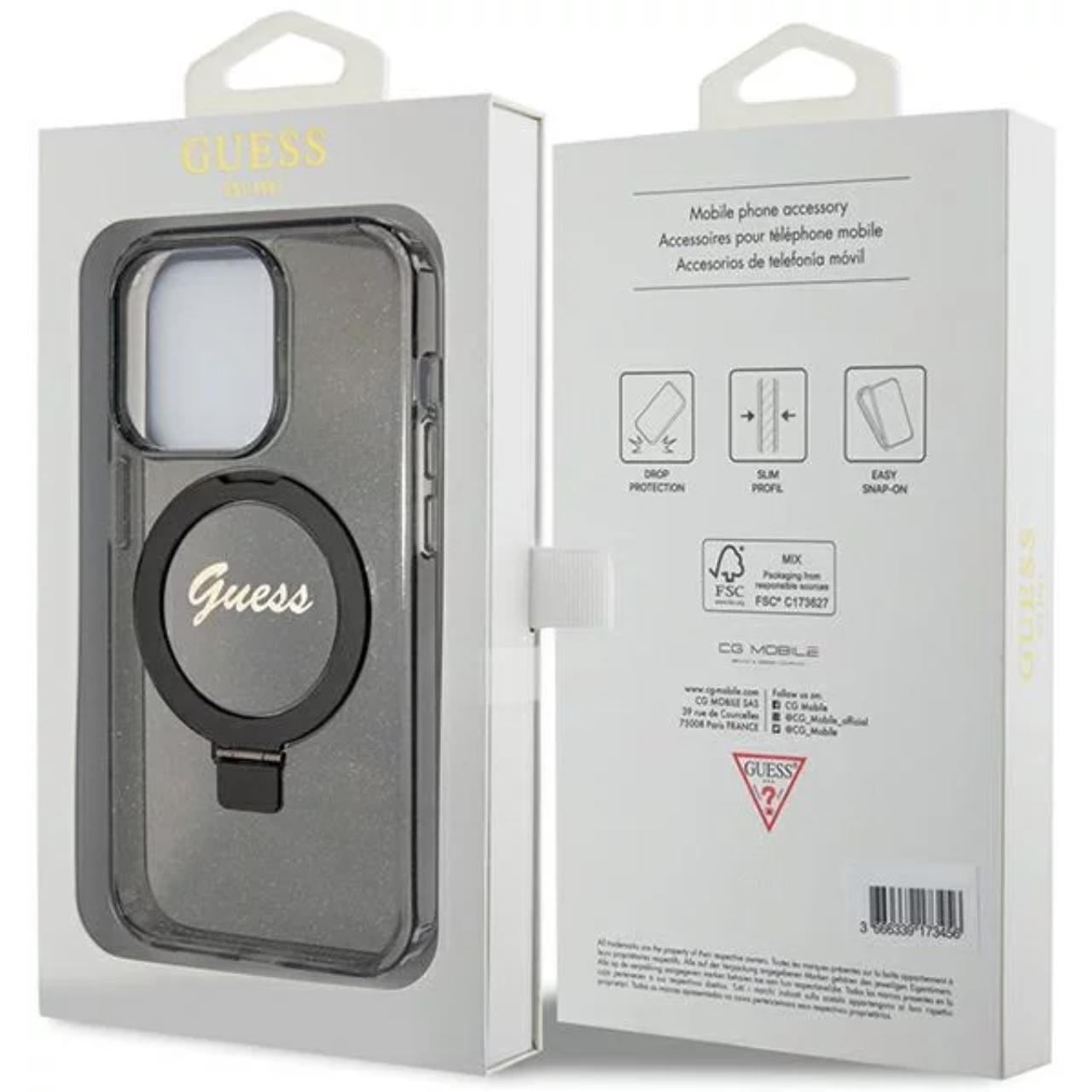 Guess Husa Ring Stand Glitter MagSafe iPhone 15 Pro Max Negru